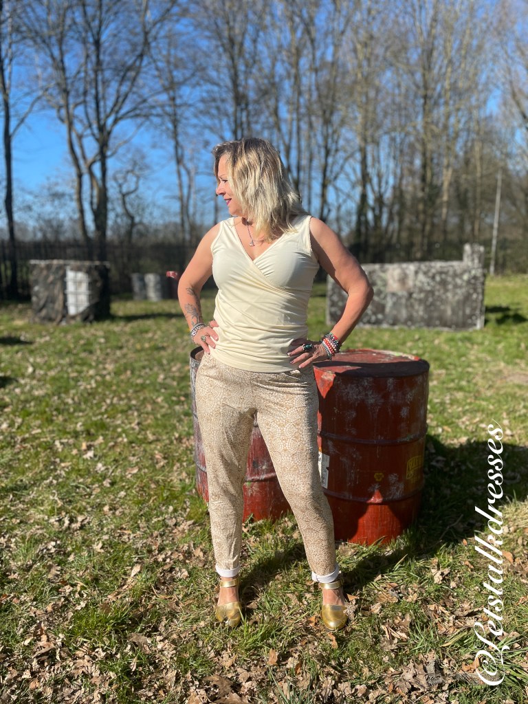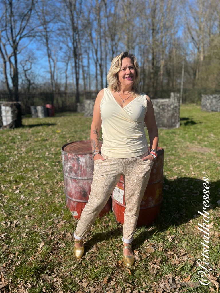 Bij deze serie koos ik de crèmekleurige Wrap Singlet om te laten zien. Het blijkt bijna dezelfde kleur te zijn als de basis van de Lounge print. Het is een ‘oude bekende’ qua model en stof (micromodal) dus een super zacht, glad en luchtig dunne stof. Op het enkel laags gedeelte schijnt hij wel een beetje door. Daar zul je met de andere kleuren geen last van hebben denk ik.