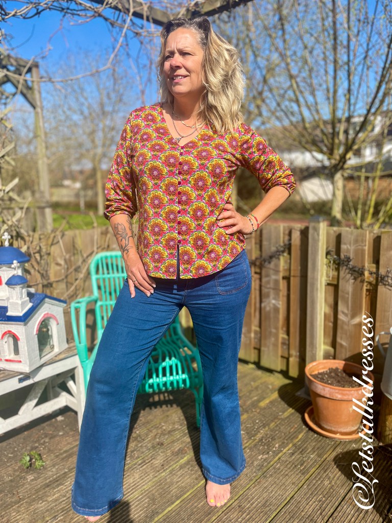 Het nieuwe model blouse van LaLamour, de Bohemian Blouse. Ik vind hem geweldig! De snit is echt zo goed! De blouse is slank in de taille met een uitwaaierende onderkant. De knoopjes gaan ook tot iets over de taille en zo heb je een soort splitje middenvoor. Dat maakt het mogelijk om deze blouse ook als ‘French Tug’ te dragen (een half voorpand in de broek- of rokband).