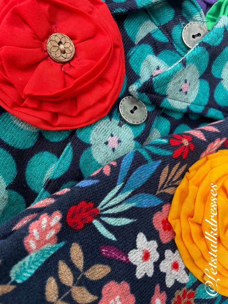 De print Ocean Retro Flowers is een zeer bekende print van Tantilly. Een eenvoudig & gestileerd bloemetje die sterk hint naar de sixties. Het roze hart van de bloemetjes maakt weer de vrolijkste combinaties mogelijk. De veelkleurige print Amore Flowers vind ik vooral knipogen naar de fifties. Een mooi bloemenboeket die zoveel kleuren heeft dat combineren al helemaal geen probleem kan zijn. De ondergrond van deze prints is donkerblauw.