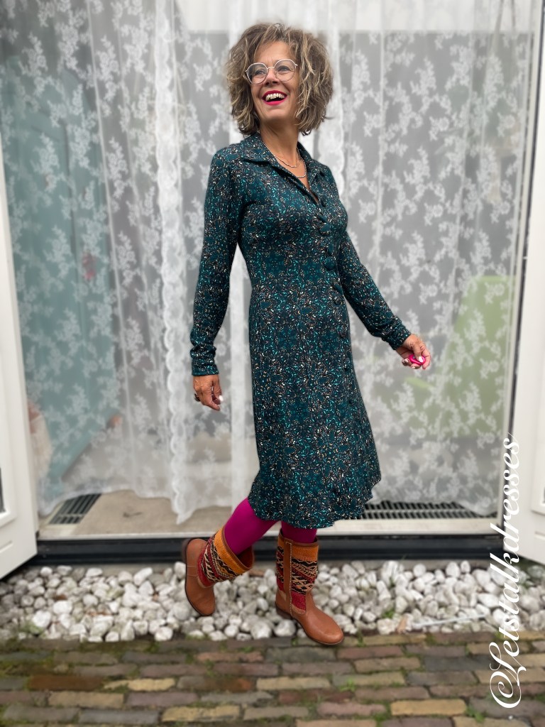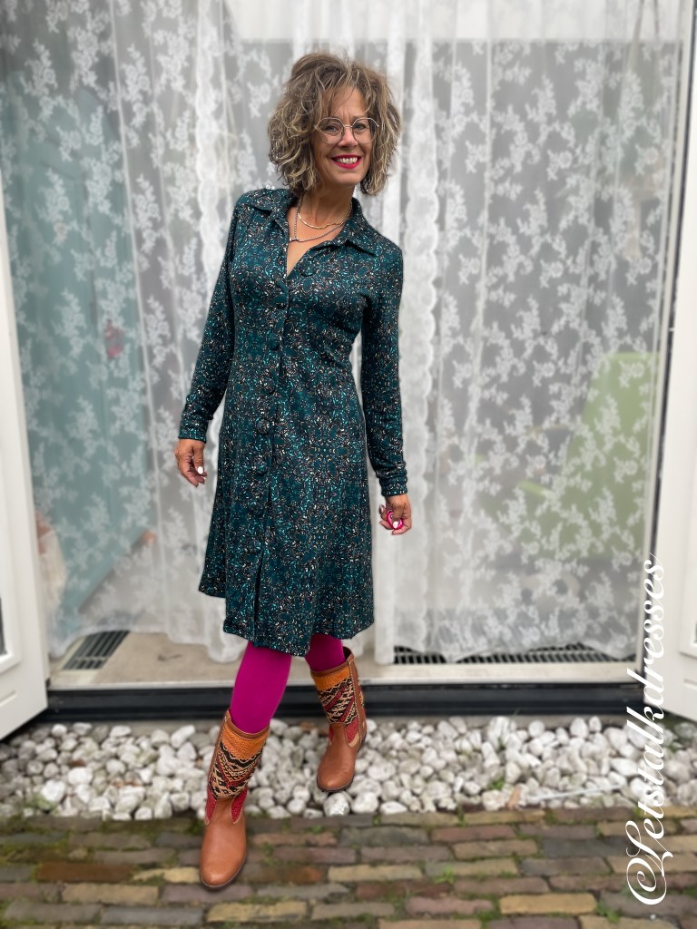De Autumn Paisley print is in de basis erg rustig en ingetogen van kleur. Niet van print want tjonge… paisley is een drukke bedoening hoor. Het doet wel Bohemian aan van dichtbij. Van veraf is het dus een rustig ogend jurkje. Naast veel mooi zeeblauw, zit er ook spatjes oud roze, crème en zalm in de print. En natuurlijk donkerblauw/groen achtig. Deze print schreeuwt om een felle steunkleur dus droeg ik er de gave fuchsia kleur legging onder.