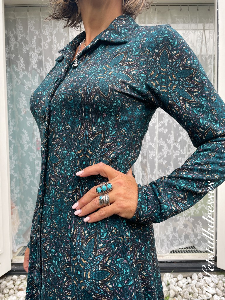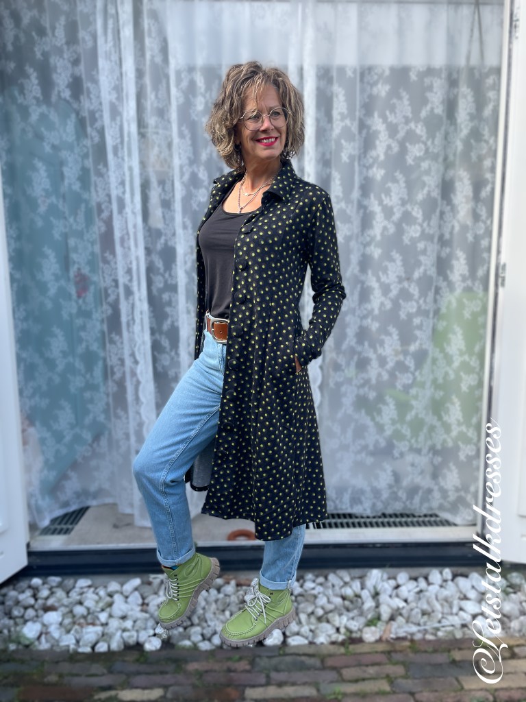 De pasvorm van de Amy Dress is slank en getailleerd. De Amy valt klein, dus raad ik je echt een maatje groter te kiezen. Ik draag op de foto’s een maat L die perfect past. Niet te strak want je wilt geen wijkende stukken tussen de knopen. En zou je de knoopsluiting dan gaan dichtnaaien, dan kan je hem niet meer dragen als vest… zou jammer zijn. De jurk is plat opgemeten in maat M: OTO 45 cm, taille 40 cm en lengte 104 cm.