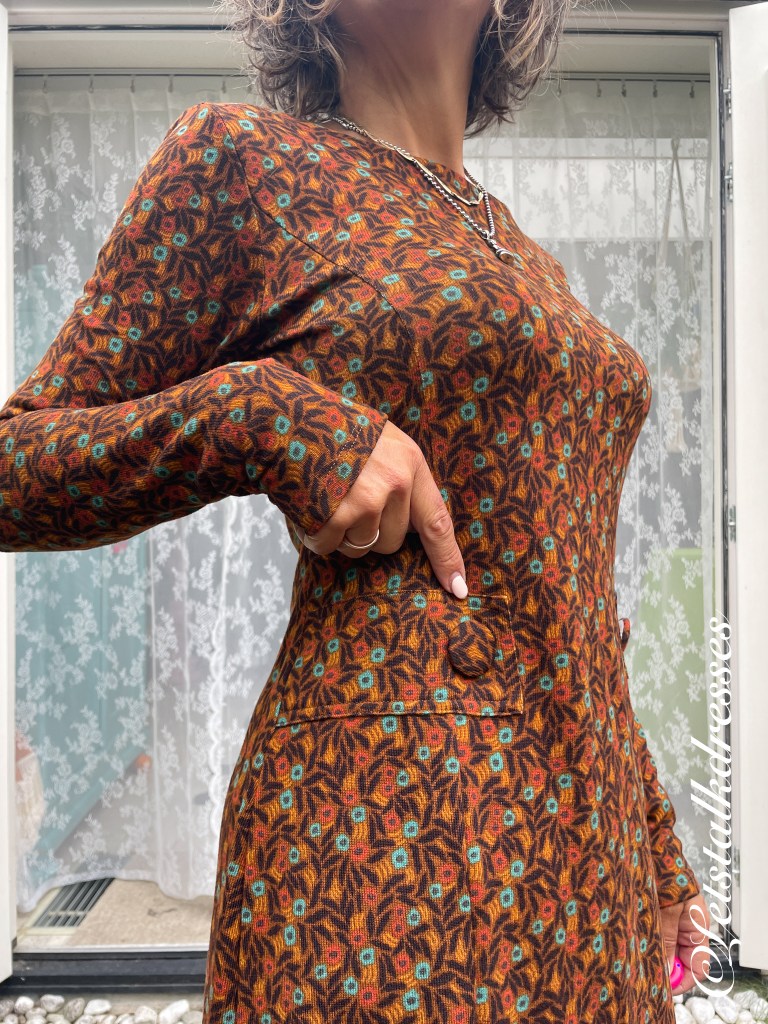 Ik heb de jurk opgemeten in maat M. De OTO is 46cm, de Taille is 44cm en de lengte van schouder tot zoom is 97cm. Zoals je ziet, is de dress niet al te lang. Met mijn lengte van 1.73m valt t ie tot op de knie. Met mijn nieuwe afmetingen vind ik de verhouding been/torso weer goed kloppen dus stoort het mij niet meer. En ’s winters draag ik vaak een legging of panty etc. Dan is de lengte van een jurk ook minder doorslaggevend.