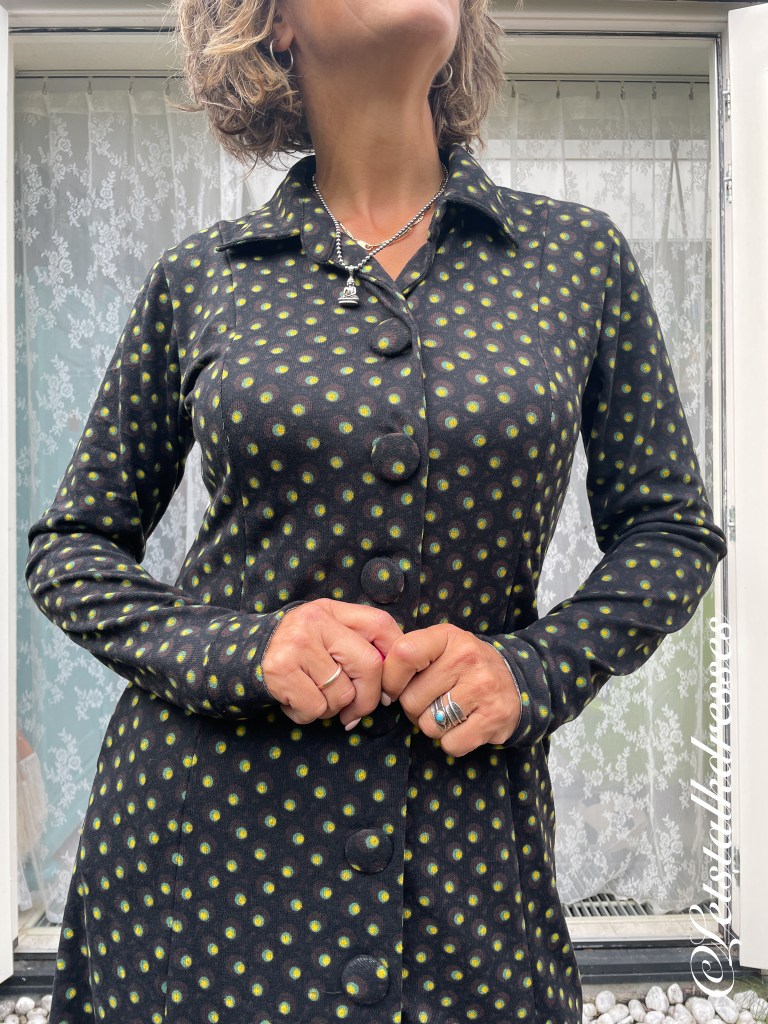 De Amy Dress is een zeer mooi getailleerde jurk met lange lengte naden in het voorpand. Dit creëert een mooi aansluitende pasvorm. De jurk heeft grote stoffen knopen die op korte afstand van elkaar zitten dus gaat ie als jurk niet/nauwelijks kieren. En ook superfijn: hij heeft ZAKKEN!!!