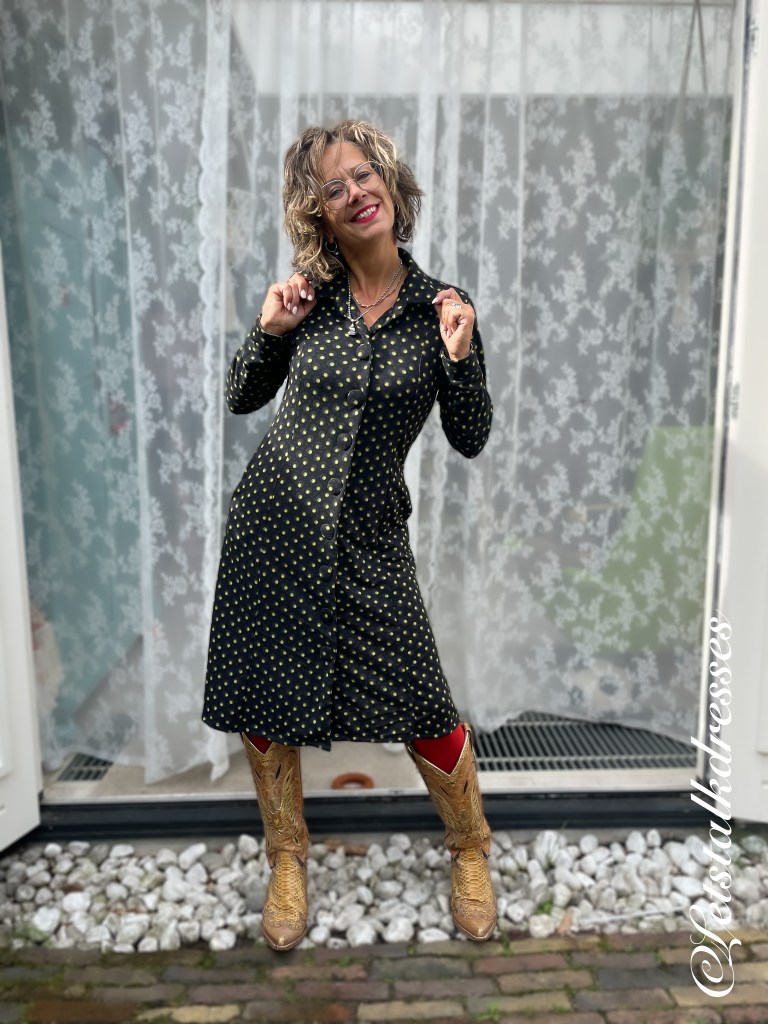 Ik laat de dress zien in 2 prints. De Yellow Dot is verrassend leuk in de details: Om de gele punt zit een blauwe cirkel die weer in een bruine cirkel zit. De onderkleur is zwart en tussen de cirkels zie je bruine driehoekjes. Dat maakt de jurk geschikt voor vele kleuren leggings en boots! Je kan hier los op styling hoor. Denk eens aan een stoere riem!