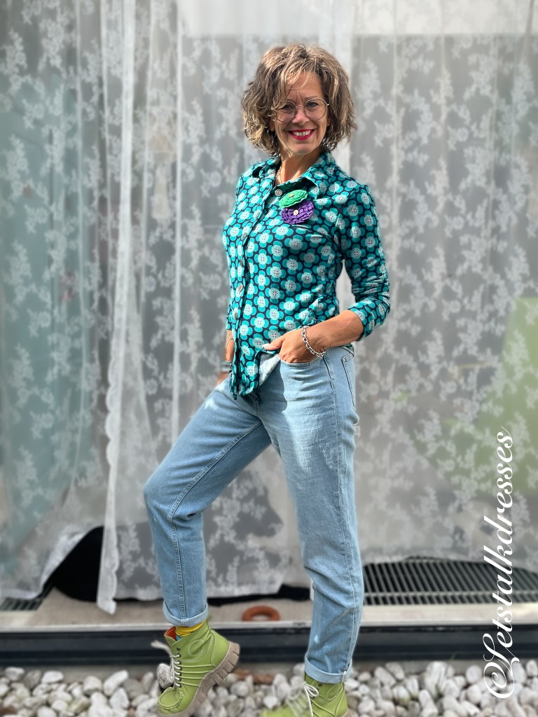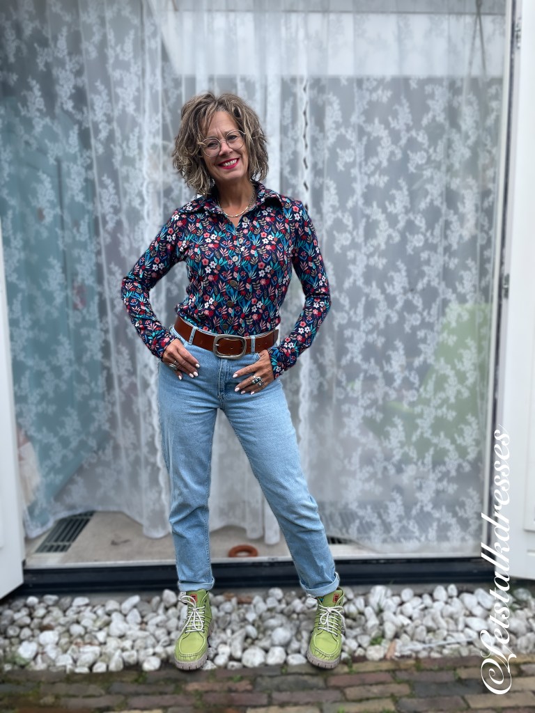Lilou is een getailleerd bloesje die zeer comfortabel draagt, zowel in als over de broek (of rok)band. Ook nu weer zijn de mouwen zeer prettig lang en afgewerkt met een boordje in dezelfde stof. Doordat de blouse licht getailleerd is, paste maat L mij wel maar ik denk dat ik een maat M ook zeker prima had kunnen dragen. Maar toen de items mij werden toegestuurd zat ik nog volop in de afvalrace en kon ik niet vermoeden al zo snel zoveel te zullen gaan afvallen…