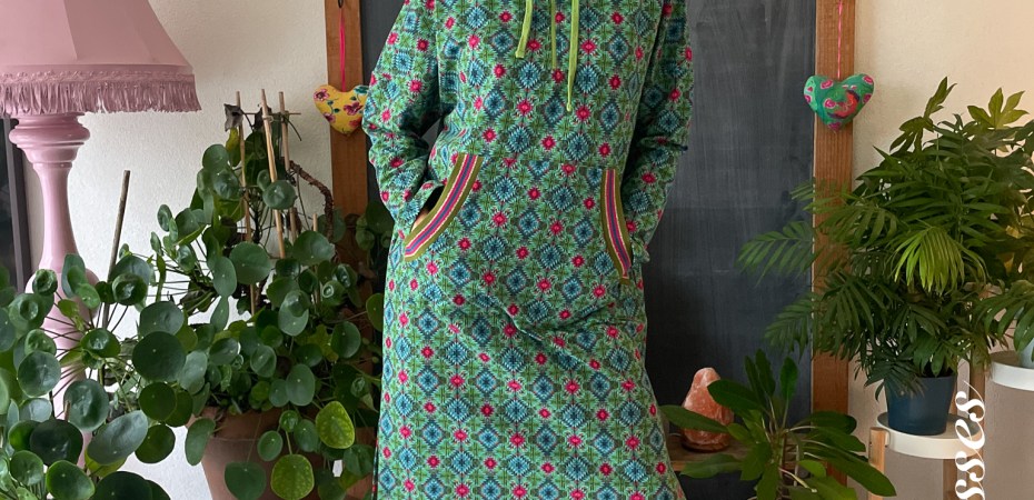 Een echte sweaterdress heeft natuurlijk ook een hoodie! Ik heb totaal geen capuchon-hoofd maar voor jullie zet ik hem even op hoor (ben de beroerdste niet). Er zit een brede platte veter doorheen dat een grappig accent geeft aan de dress.