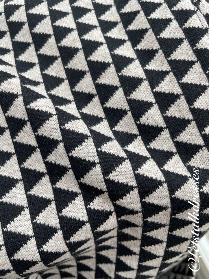 Het patroon ‘Strike’ bestaat uit twee rijen met liggende driehoekjes in zwart en wit. Nou brak ik mijn hoofd over de naam van dit patroon… jullie ook?? Na veel speuren op internet gaf ik mij gewonnen en stelde de vraag maar eens bij Tante Betsy. Het antwoord bleek simpel en grappig tegelijk: het originele ontwerp waren bliksemschichten (strike) maar dit bleek een te ingewikkeld patroon om in jacquard te breien. Daarom is het ontwerp aangepast maar de naam bleef gelijk.
