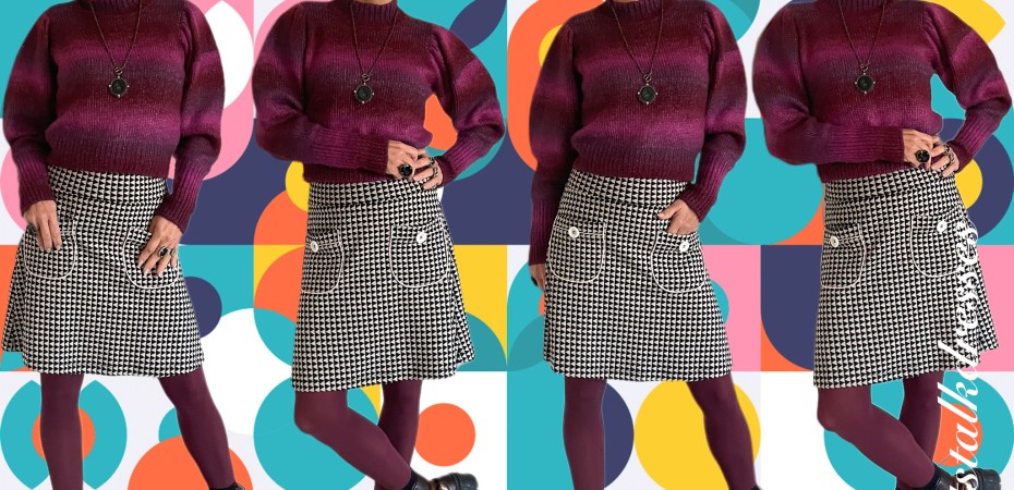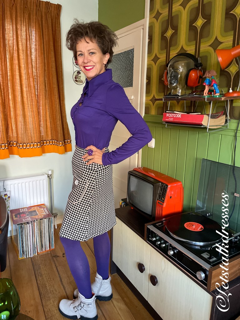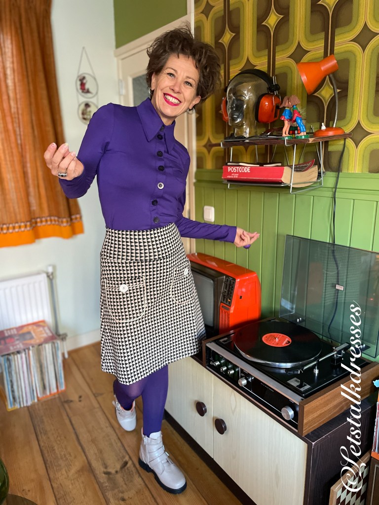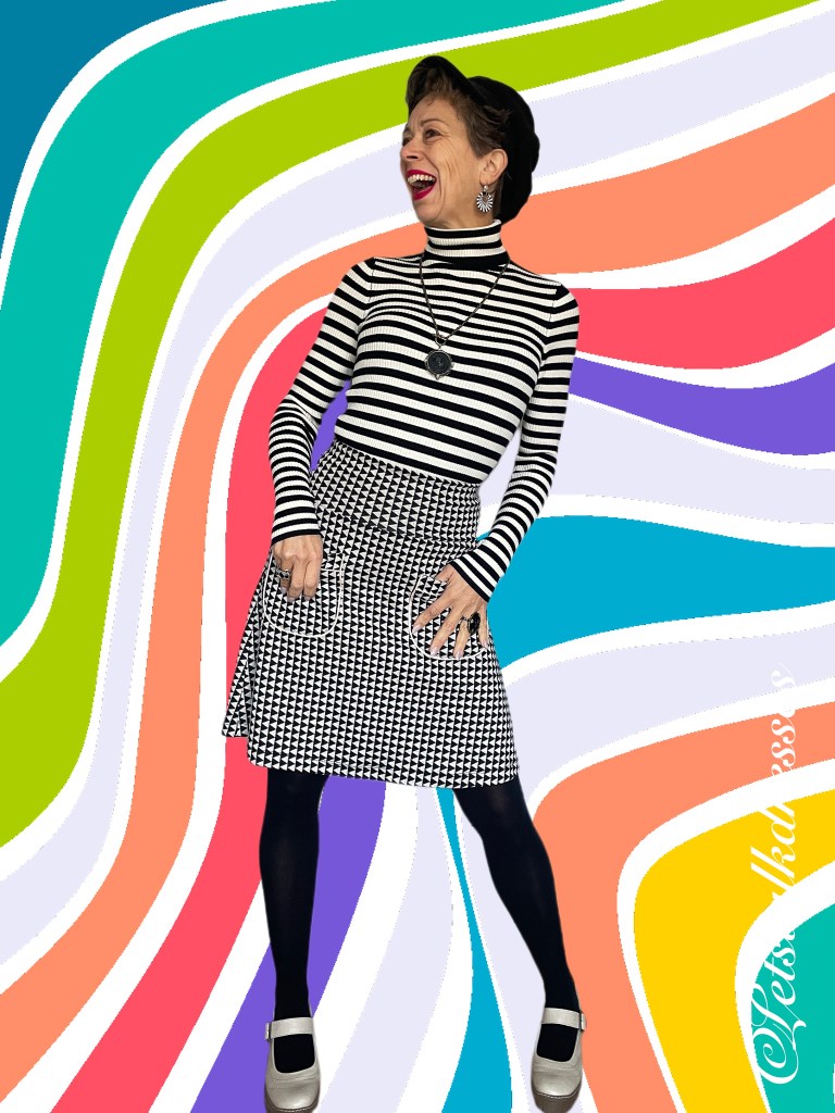 1. Wat een onwijs leuk rokje! En wat onverwacht leuk is de combi met het gestreepte coltruitje! Ik heb van dit model een exemplaar in rood velvet. Ik las bij een van de verkooppunten in een review (ik weet niet meer welke) dat die ook heel klein uitvalt en dat was maar goed ook. Ik heb ‘m een maat groter besteld dan ik doorgaans draag bij Tante Betsy en hij zit niks te ruim. Is toch altijd fijn, die feedback van de mensen die de kleding al gekocht en gedragen hebben.