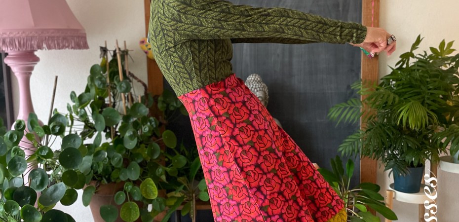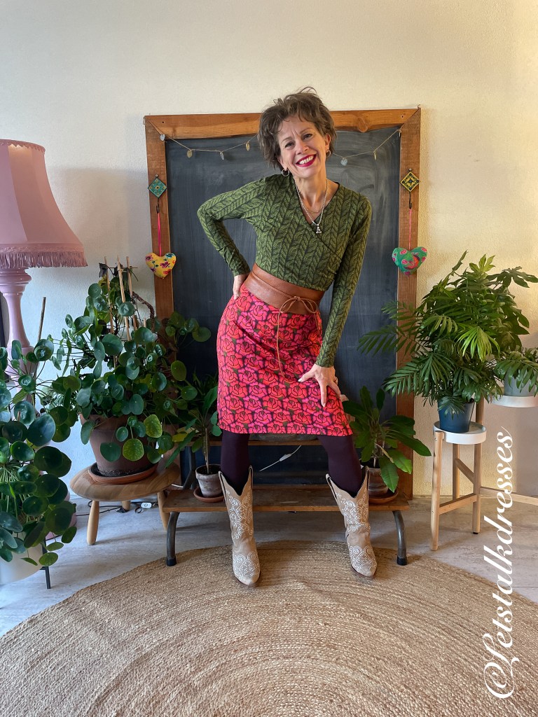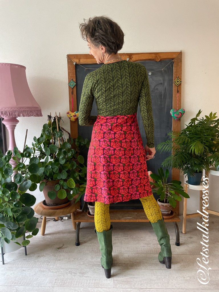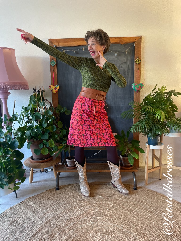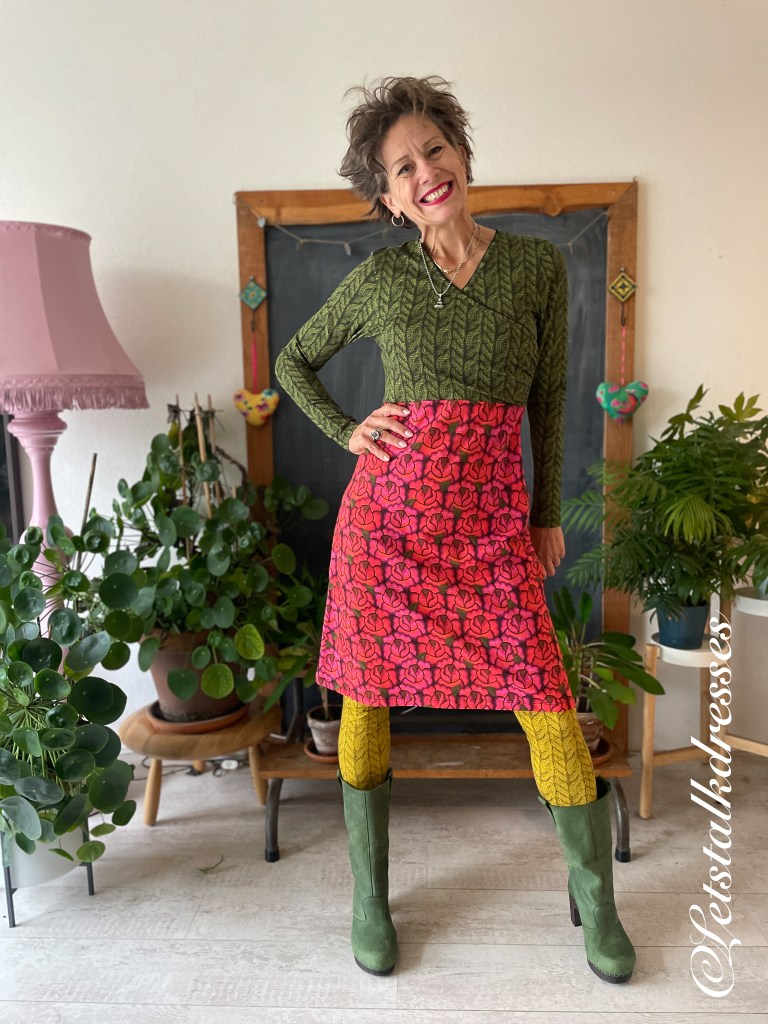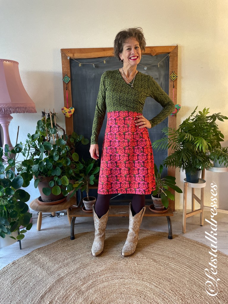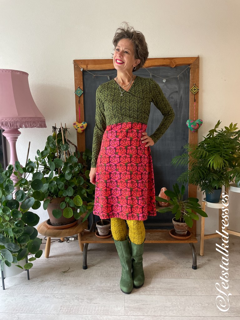 Het rokgedeelte van deze jurk begint ter hoogte van de ribben: een empire waist noemen we dat. Het maakt je optisch langer en slanker, zeker ook omdat er een verschil in prints is tussen het boven en onderlijf. De rok is een A-lijn en valt mij met mijn lengte op de knie. Ik vind dit altijd een hele fijne lengte.