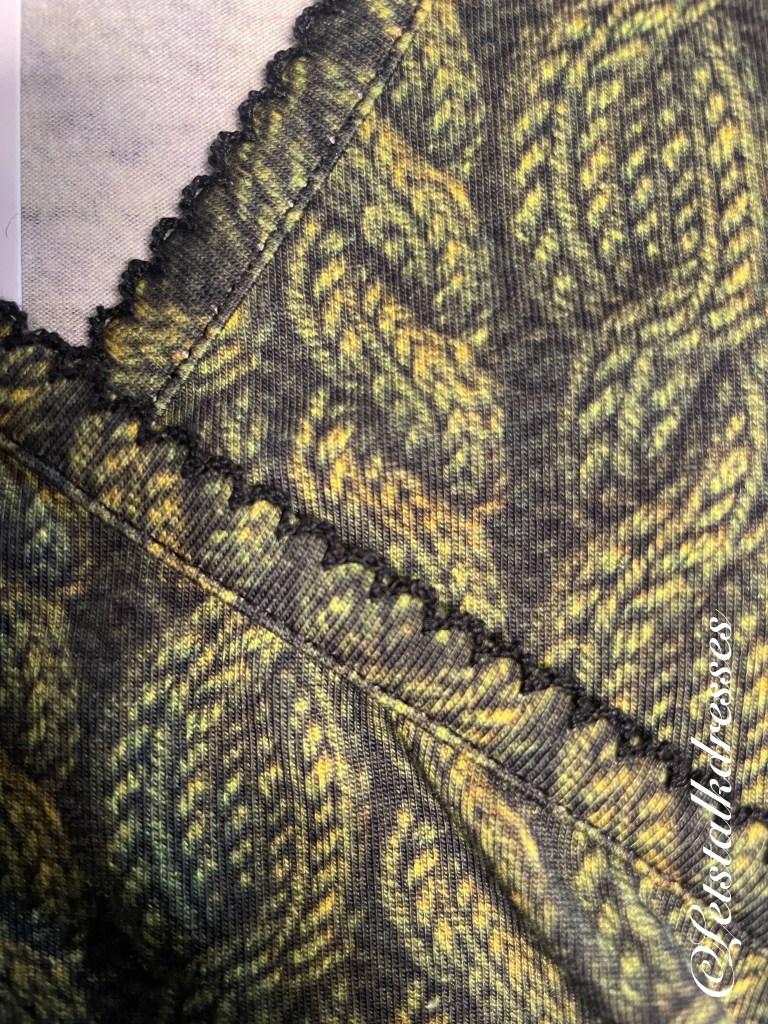 De halslijn kan je op twee manieren dragen: zoals ik op de foto’s doe: de twee helften gewoon laten vallen zoals de stof wil, of iets ondeugender, de twee helften onder de buste door getrokken. Omdat ik dat zelf nooit zo draag, heb ik ook in deze blog dit niet laten zien. En natuurlijk is deze halslijn weer mooi afgewerkt met het bekende kantje!