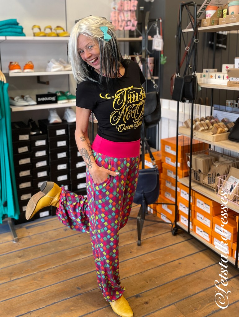 De sneaky verrassing was het shirt van Queen Kerosin. In een XS by the way, maar met een tekst die ik weer te grappig vind: ‘Trust No One’… Altijd goed en heel fijn te matchen met zoveel. En jullie weten het toch? Ik zal altijd tegenover al het zoete iets vuigs zetten, iets stoers… Anders is het gewoon geen Caro-outfit hihihi. De pruik werd mij (enigszins onvrijwillig) uitgeleend door de paspop, die keihard getackeld werd door Ida hahaha.