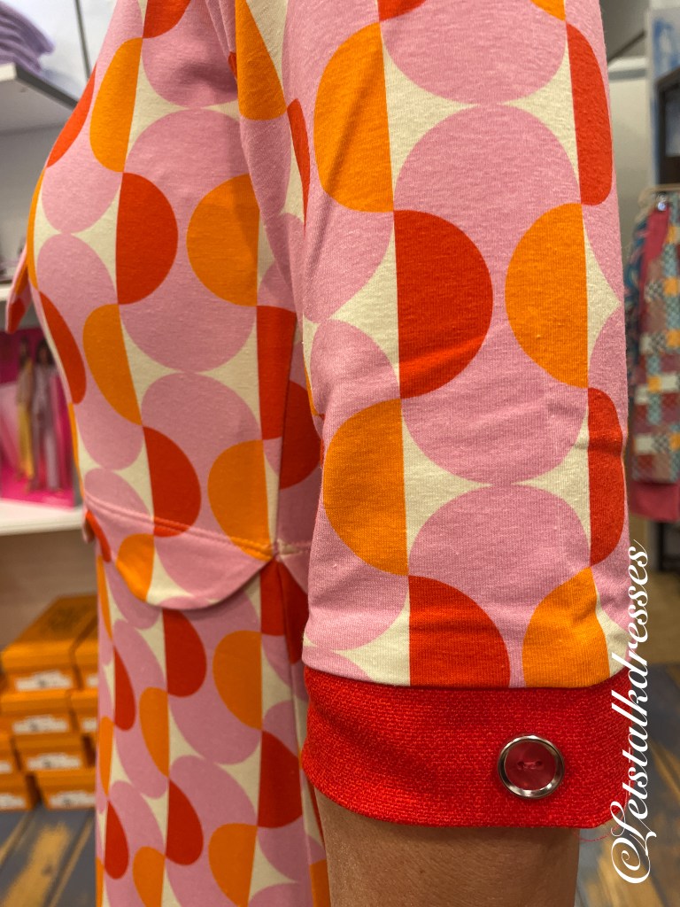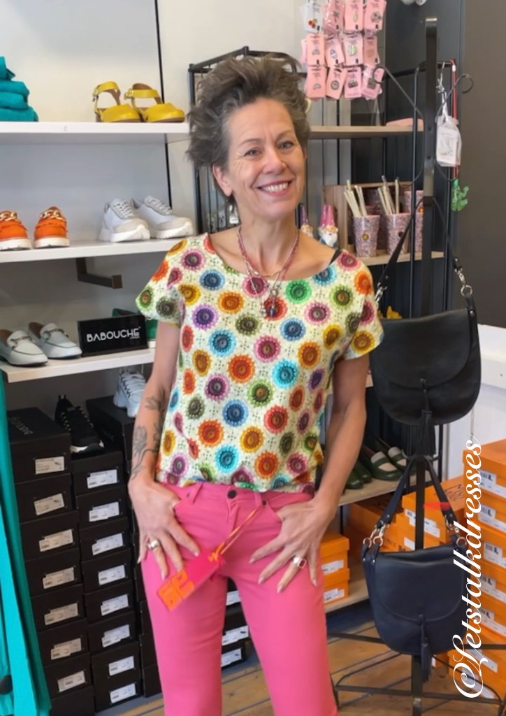 Wat ik bij Binnie op de website (klik: http://www.somuch.nl) al zag was deze top van MARGOT: die kleuren, dat boordje… mmmm wat een leukerd. En dan bij het aantrekken nog in ooohhh en aahhhh vallen omdat je die geweldig geinige mouwtjes niet eens had opgemerkt!! Ik ben sinds het afvallen wel ruimer in mijn kledingkeuze gaan zitten. Ook shirts en rokjes draag ik nu graag. Dus, ja vooraf wist ik al: dit shirt moet mee!