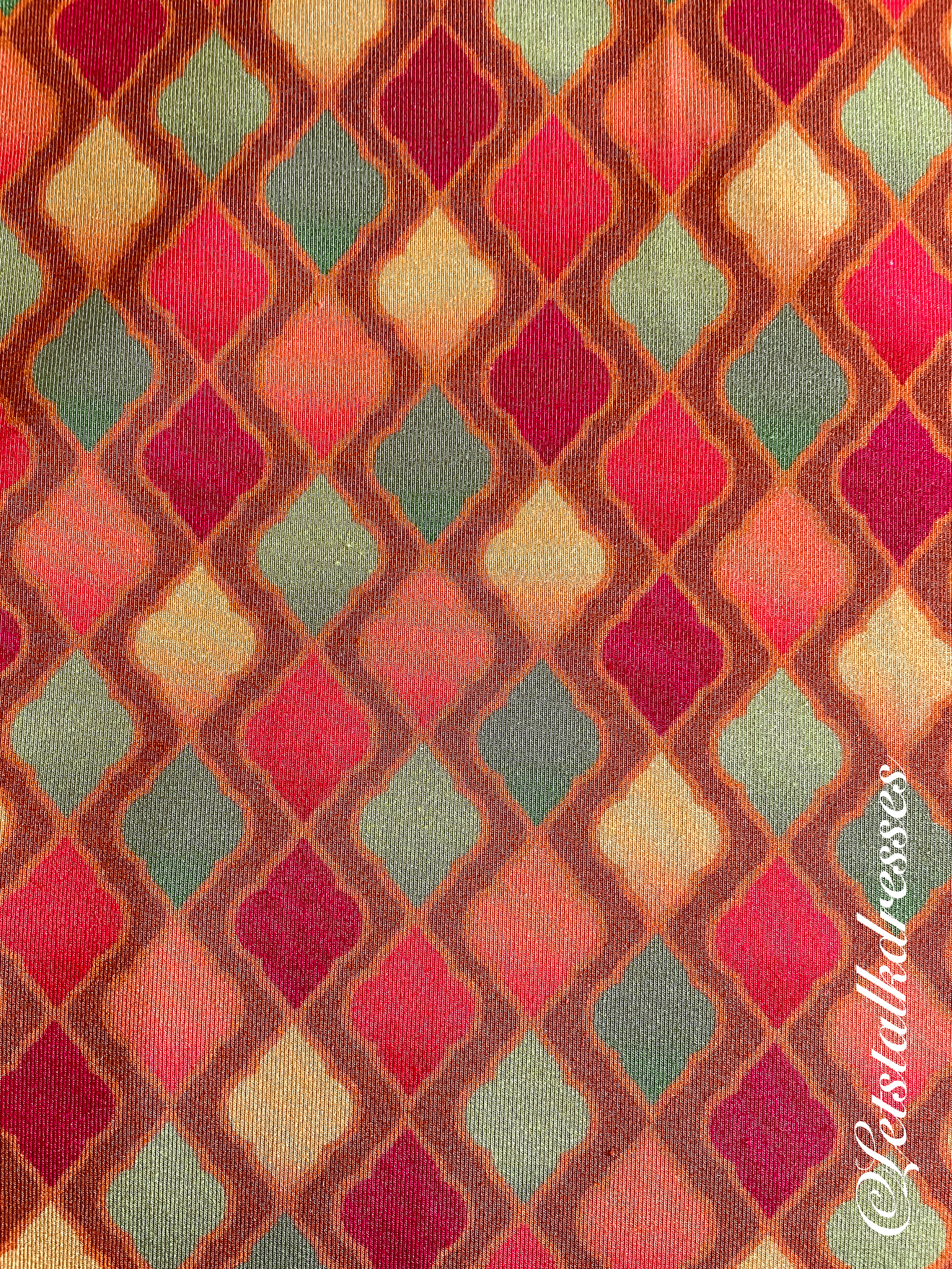 De print Oriënt is zo subtiel schitterend! Het zijn een soort oosterse raampjes die verschillende kleuren hebben maar allemaal wel die oploop van licht naar donker hebben: in drukkerstermen: een rasteropbouw. Je ziet de puntjes (het raster) goed als je er een loepje op zet.