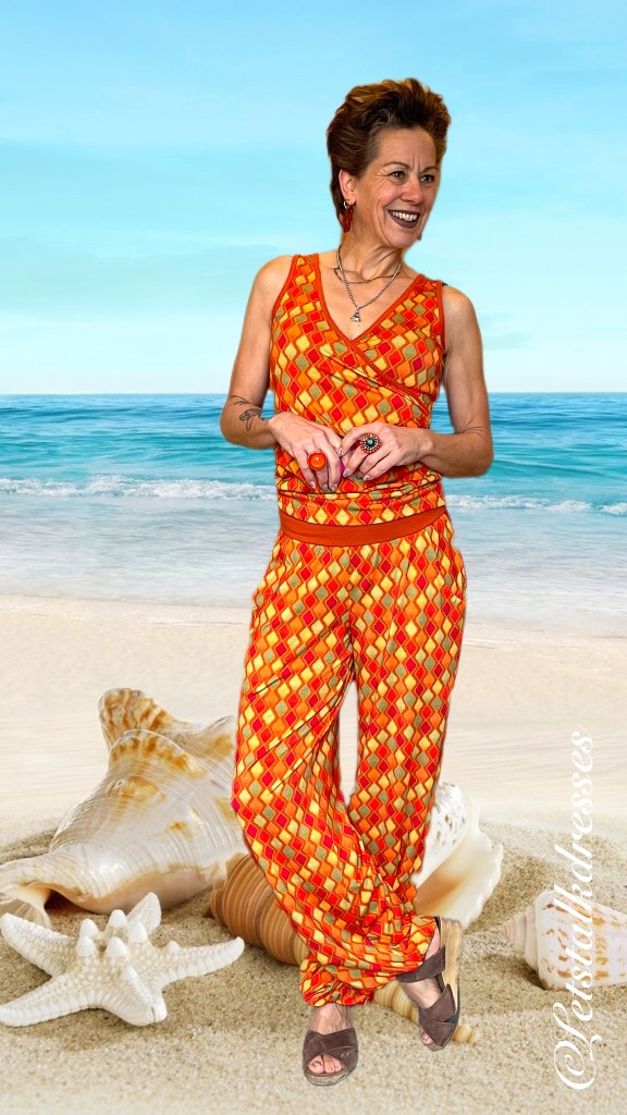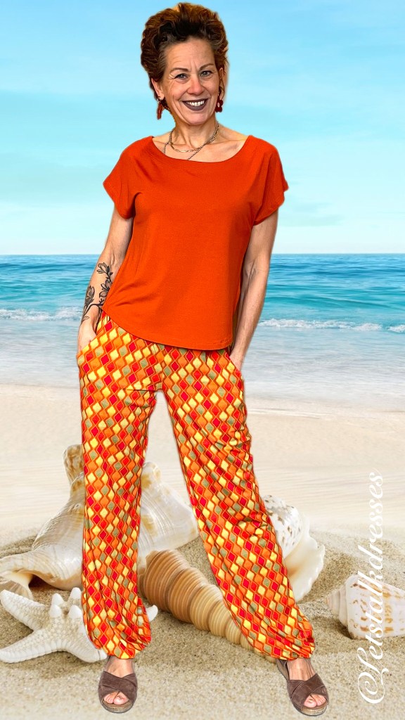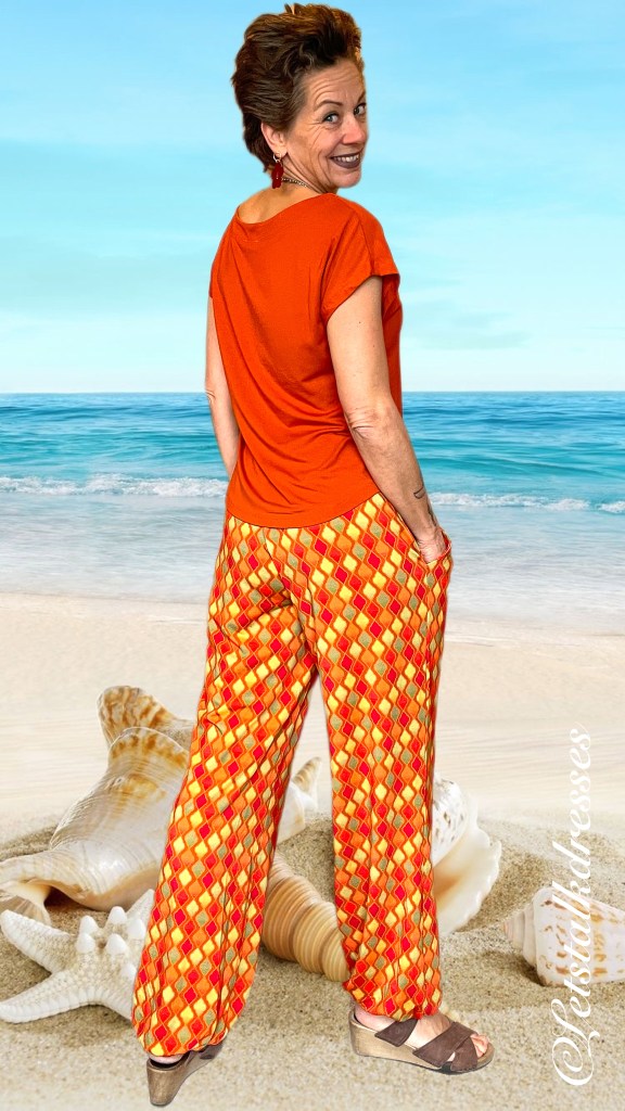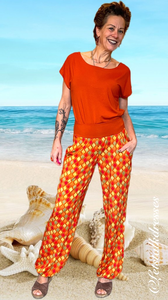 De zoom van deze pants is een oranje bies die smaller is dan de broekspijp waardoor je een pof-effect krijgt. De bies heeft geen rek waardoor het losjes om de enkel blijft hangen. In combinatie met de gekozen stof voor deze print, Micromodal, valt deze broek werkelijk prachtig! En micromodal is een echte vochtregulerende stof zodat hij de hele dag door koel en luchtig blijft aanvoelen.