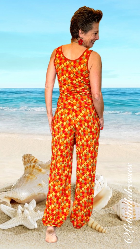 De broekspijpen zijn net als de Palazzo pants lekker wijd. Maar de Oriënt Pants valt al wijd vanaf de tailleband, waar de Palazzo nog aansluitend blijft. Het kruis hangt een klein beetje lager dus je hebt geen gedoe met de beruchte ‘cameltoe’. Zoals je wil van een zomerbroek, knelt hij dus nergens.