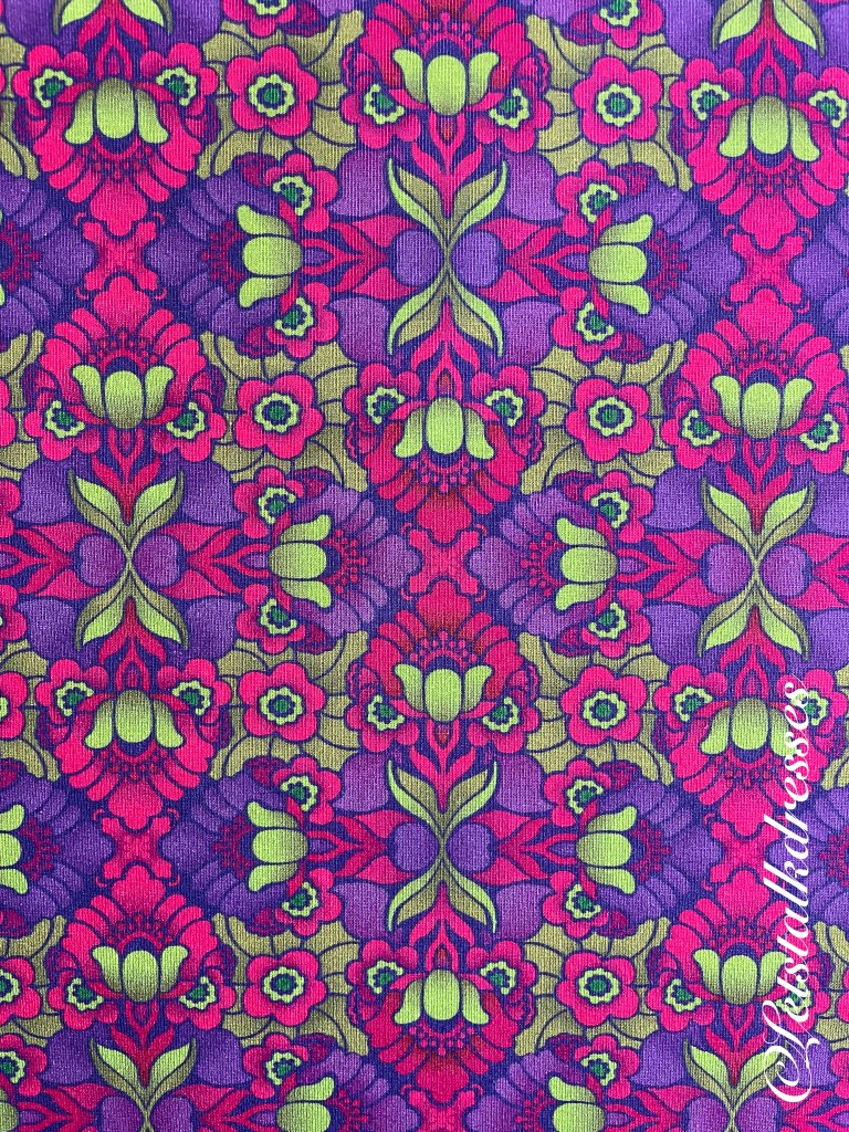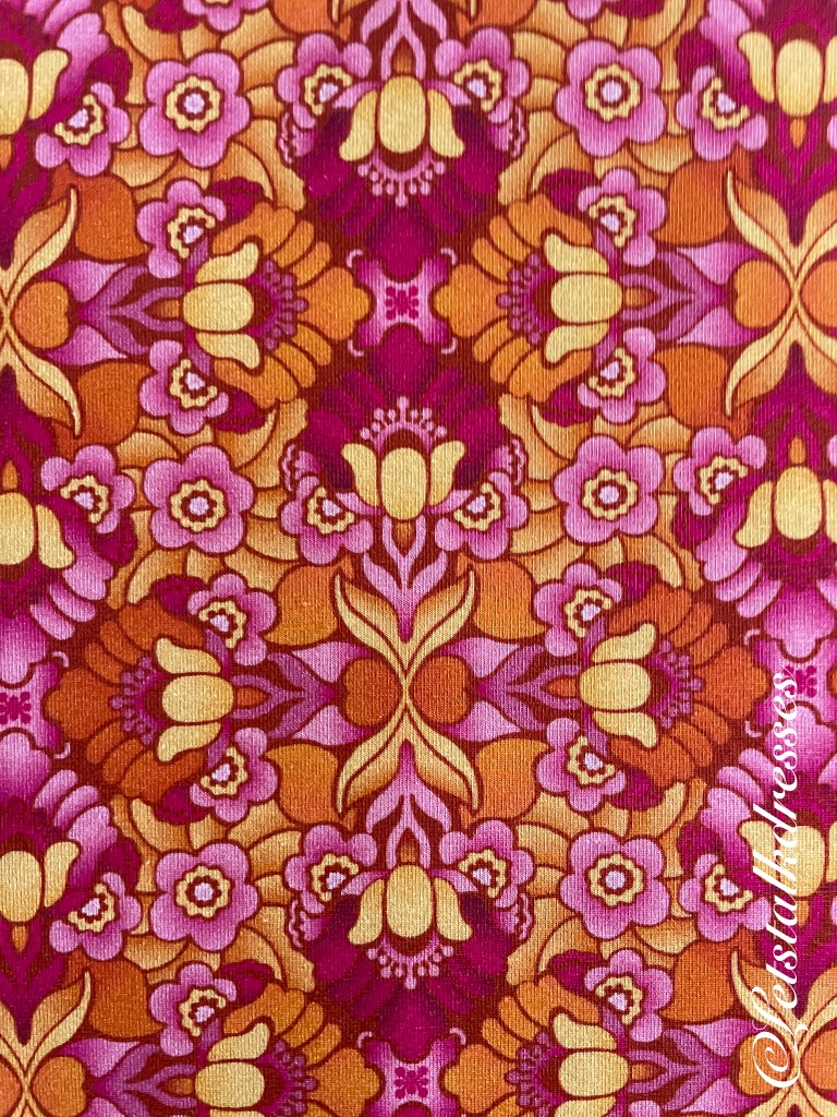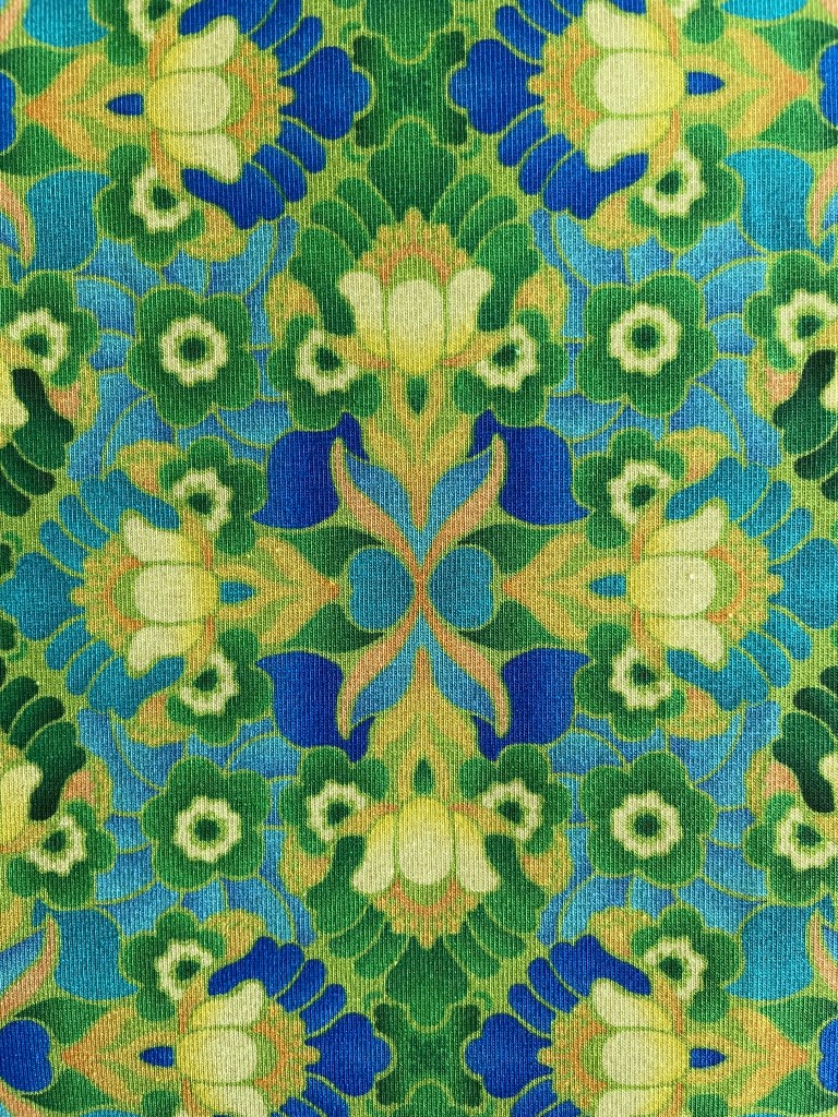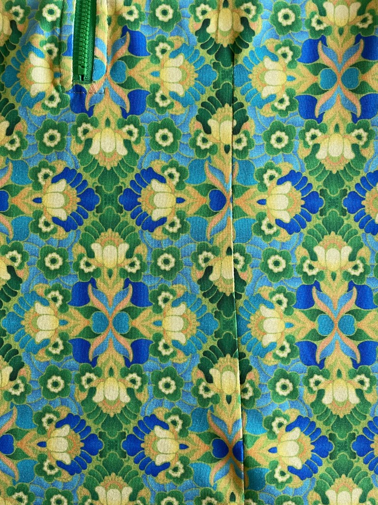 Heel bijzonder is dat de Blue/Green Flower print veel zachter lijkt dan haar twee kleurenzusjes. Hebben de bloemen van de paarse en oranje variant een contrasterend lijntje om de lichtje bloemblaadjes, de groene print heeft dit niet: de lichte bloemblaadjes hebben juist een lichtere tint omlijsting. Hierdoor lijkt de print diffuser, wat wazig. Het maakt dat de jurk wat minder hard overkomt.