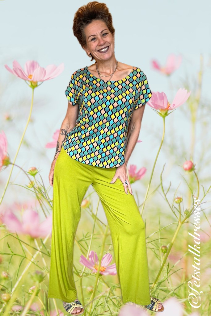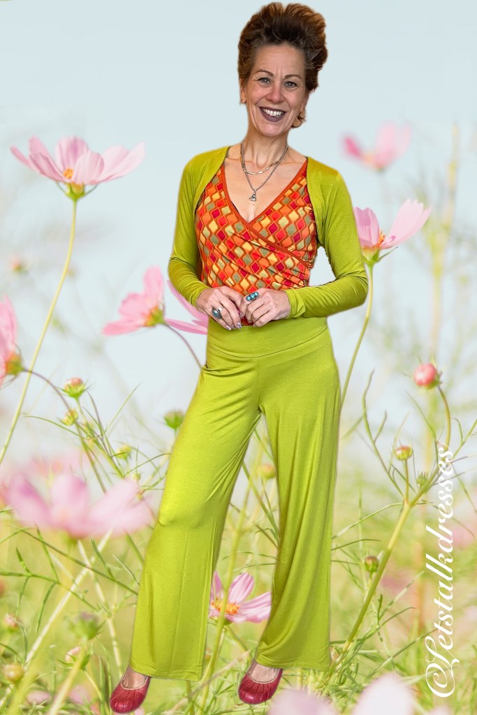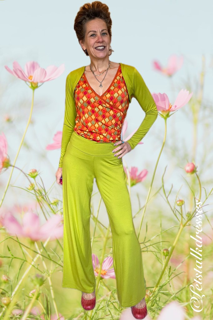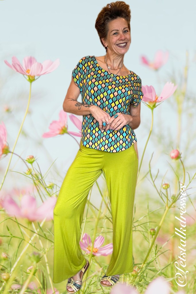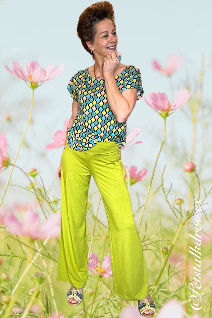 Ik laat jullie de Palazzo Pants zien in de kleur Golden Lime. Een mooie felle lichtgroen die net een tikje feller is dan appelgroen. De kleur is heel warm en helder en past helemaal in het zomerpallet van 2023.