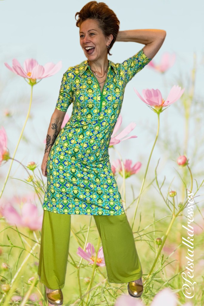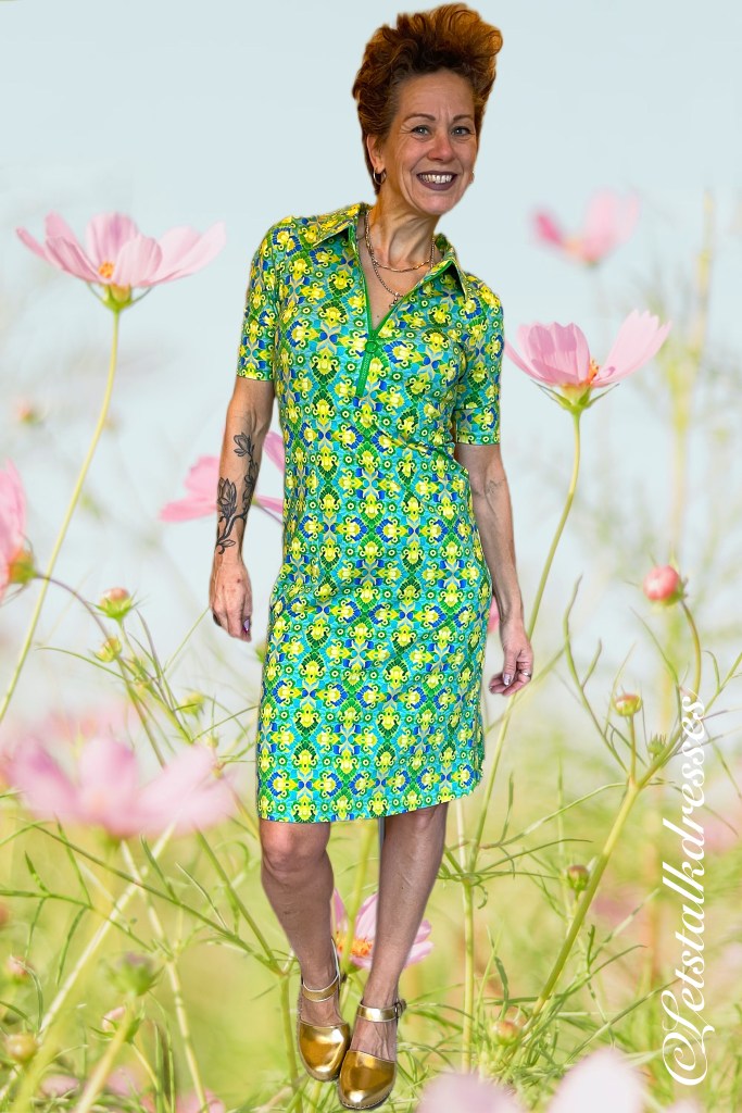 De Zipperdress is natuurlijk ook weer een goed basismodel van LaLamour die wij elk seizoen weer terug zien komen in de collecties. Dit zomerseizoen is de Zipperdress uitgebracht in de Flowerserie. Dat betekent dat je hem kan vinden in de winkels in de kleuren Umber/Orange, Purple/Pink en Blue/Green. Ik heb de laatste kleurenmix gekozen.