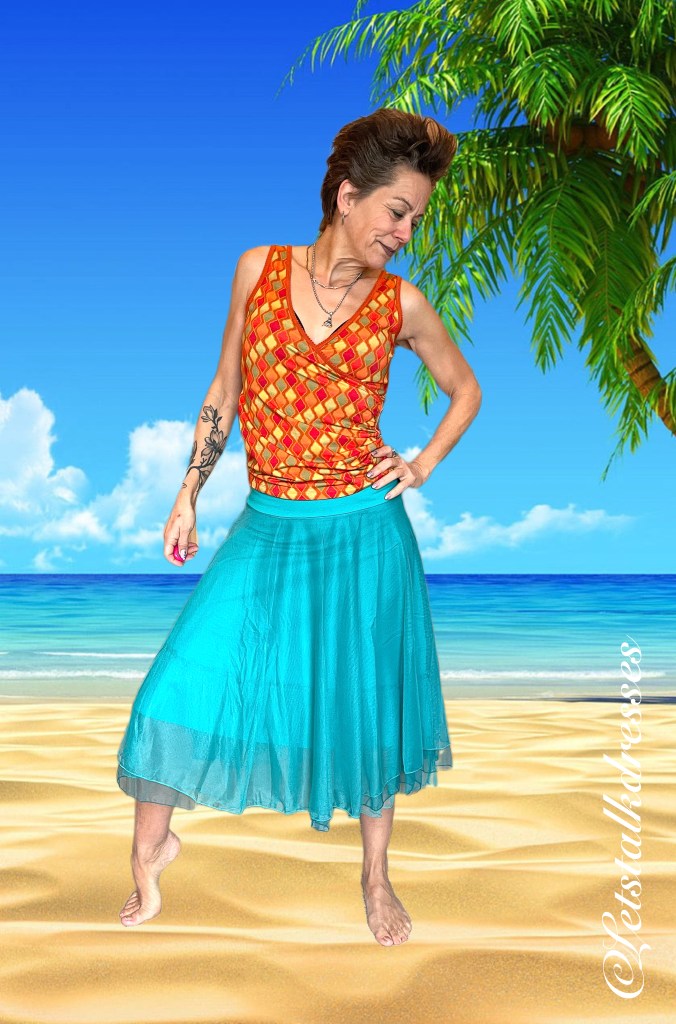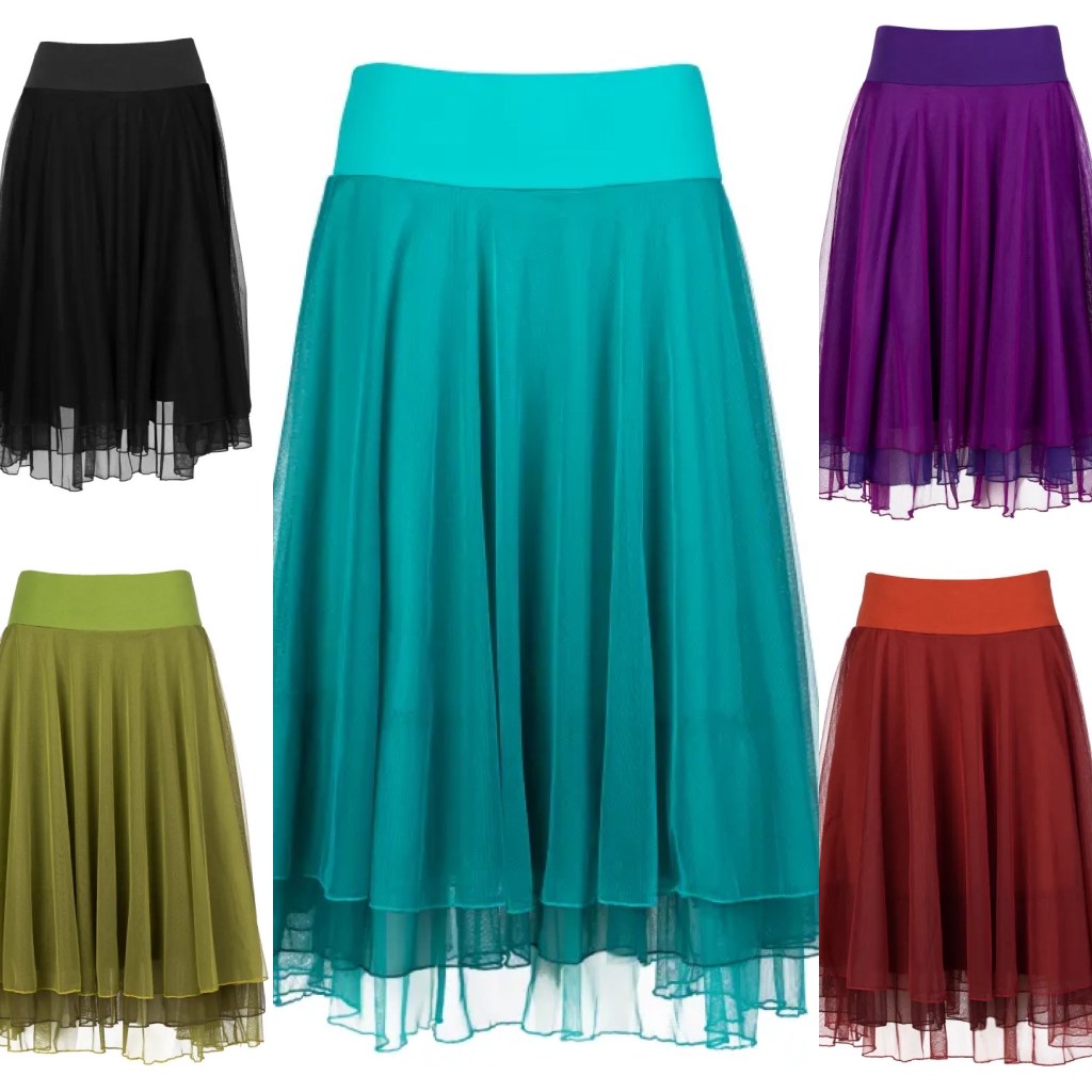 Het tule (of eigenlijk mesh-stof) is gemaakt van nylon. De stof is super zacht en lekker zwierig. Door de stevige zoom vallen de lagen wel heel mooi klokkend. De tricot onderlaag maakt de rok lekker draagbaar, niet statisch en niet zweterig.