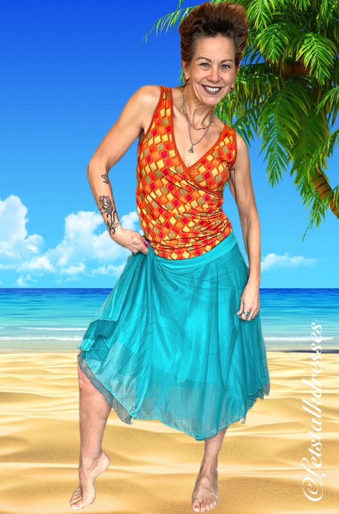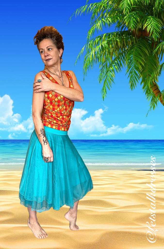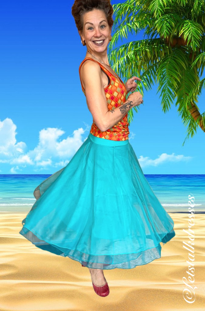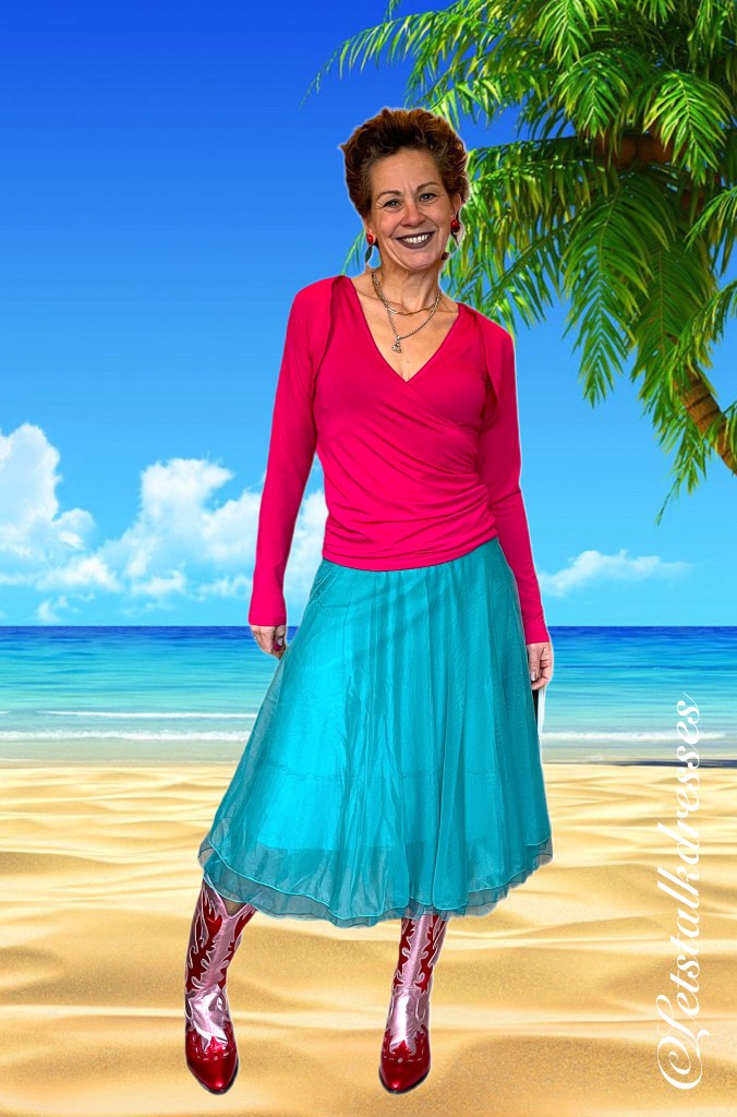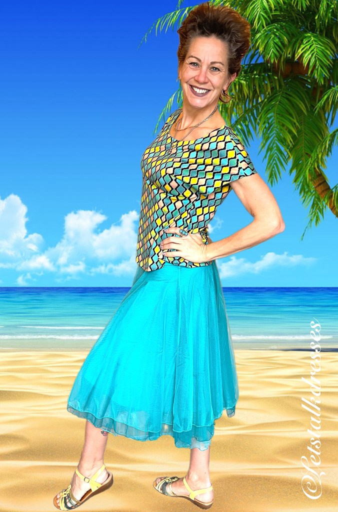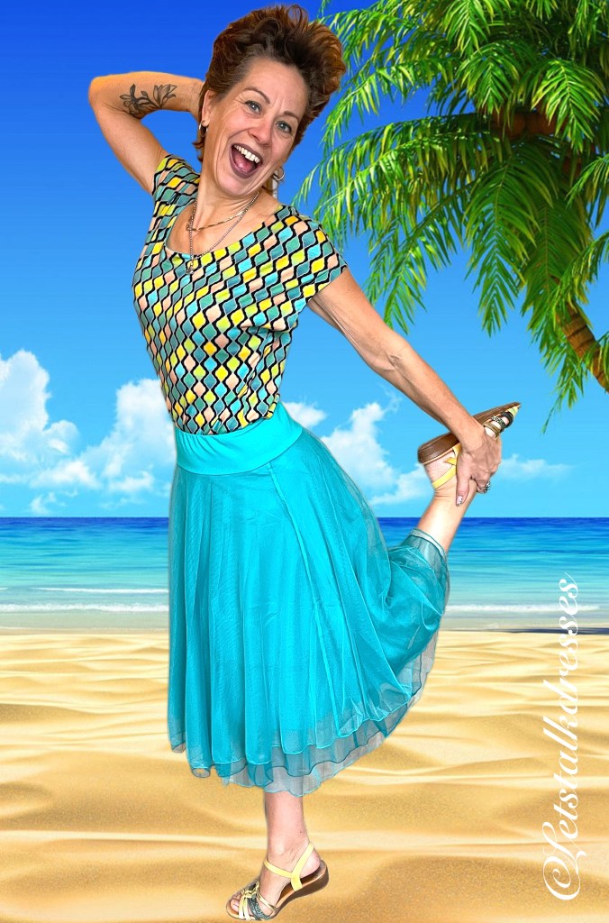 Deze zomer heeft LaLamour de petticoat uitgebracht in 5 kleuren. Ik wilde graag de turquoise variant laten zien. Een lekker frisse, pittige blauw die fantastisch combineert met de Bright Rose tint uit de Plain-serie. Ik draag hier de Wrap Singlet en de Sleeve Piece in deze kleur. Lekker knallen met tinten, daar houd ik van.