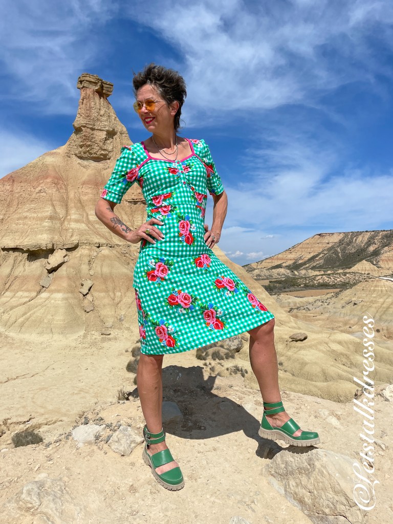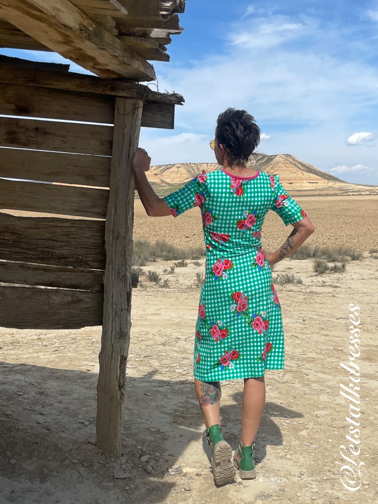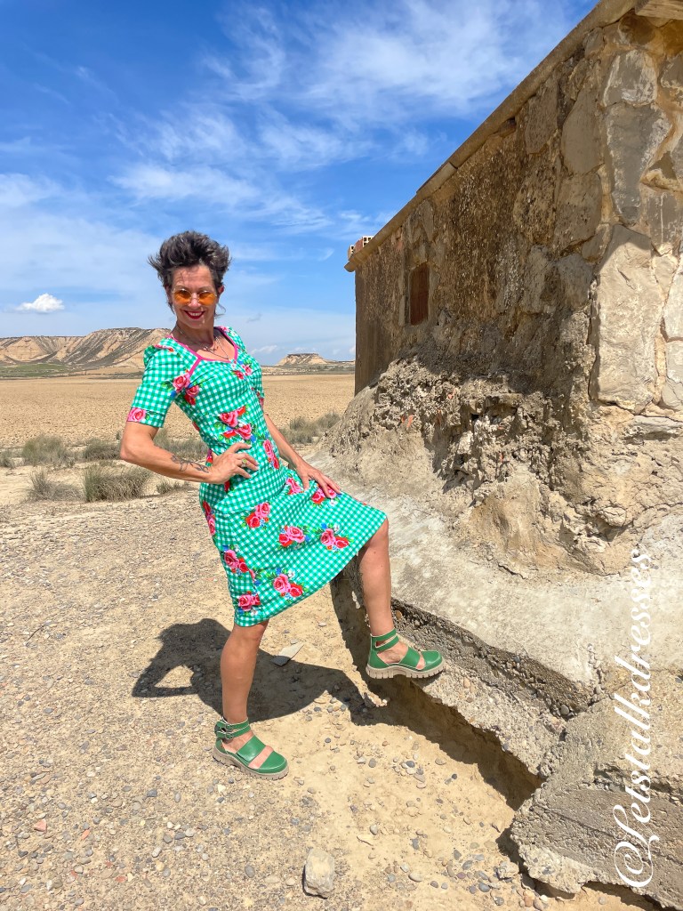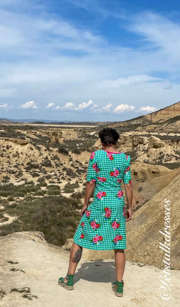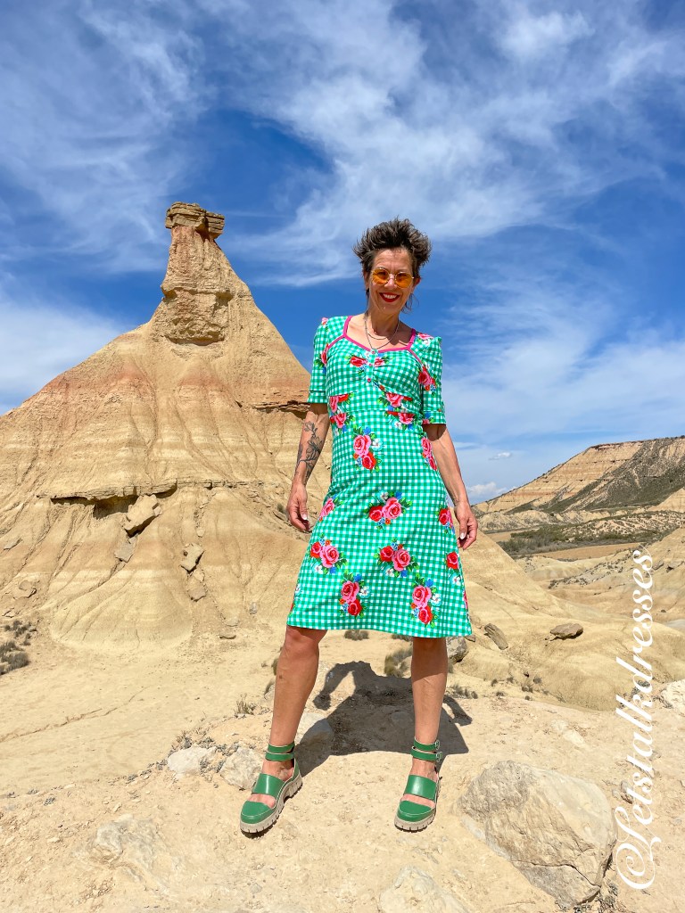 In Spanje vind je de enige woestijn die Europa rijk is: Bardenas Reales. Een prachtig (en helaas verdwijnend) natuurgebied. Ik vond dit een uitgelezen kans om een fotoshoot te maken van deze mooie Lola Dress!! De print ademt voor mij toch een soort ‘Kleine huis op de Prairie” gevoel uit. Dat past natuurlijk fantastisch in deze omgeving.