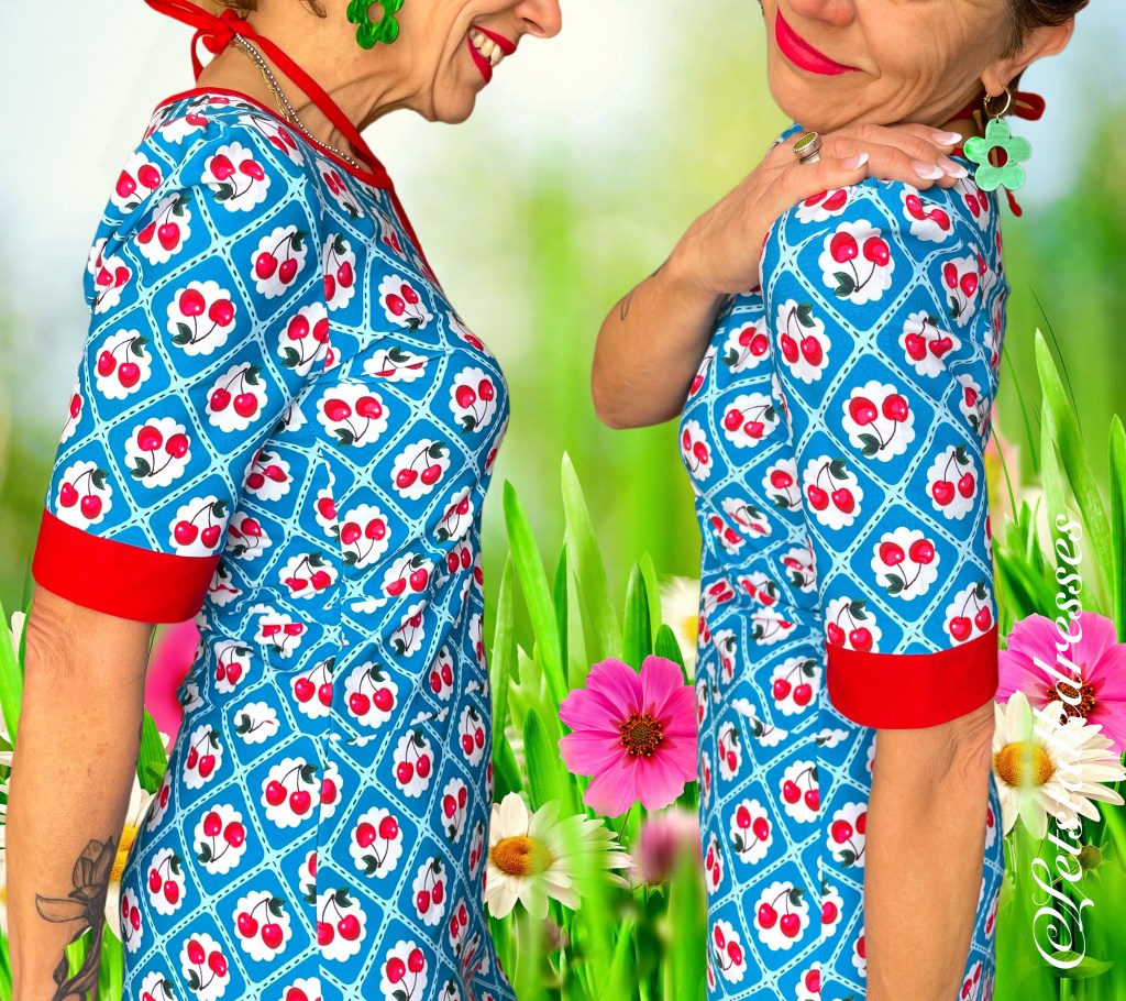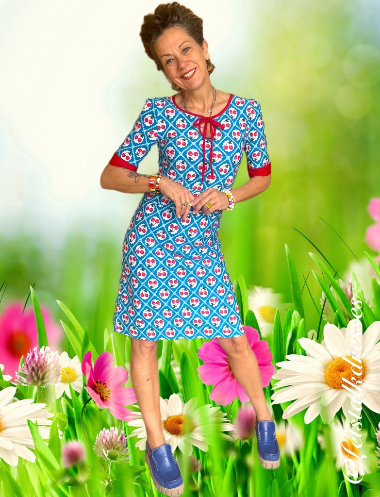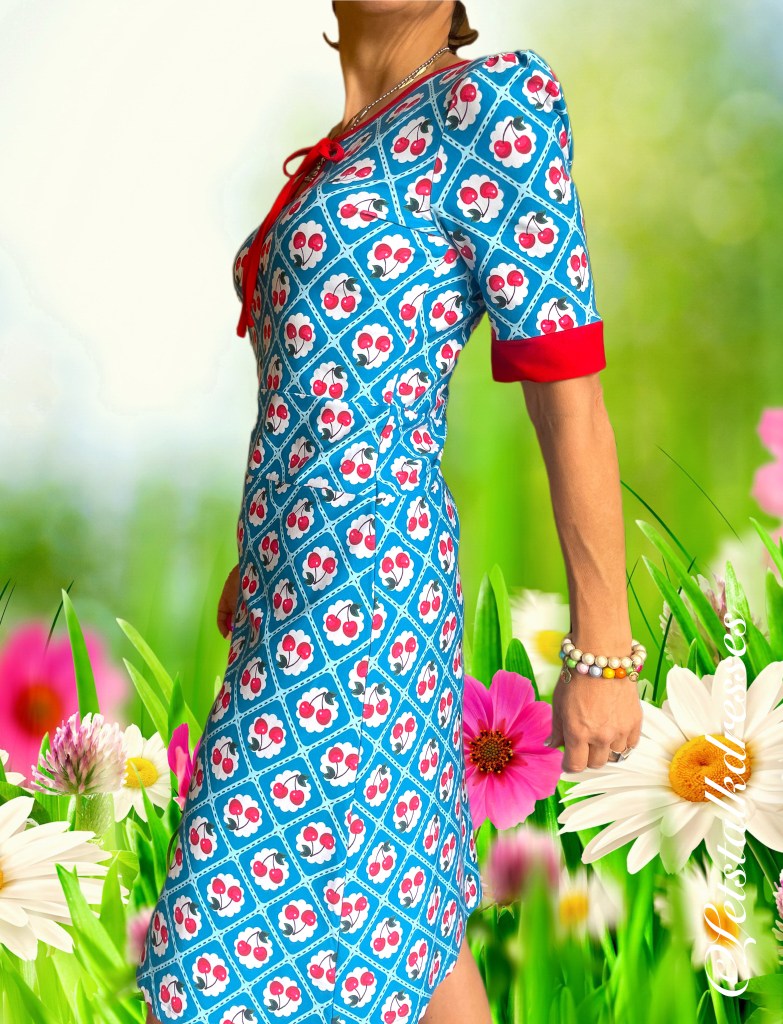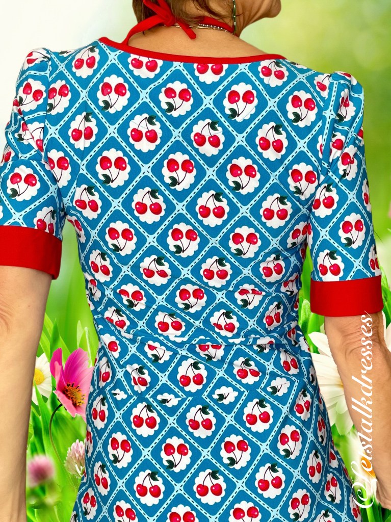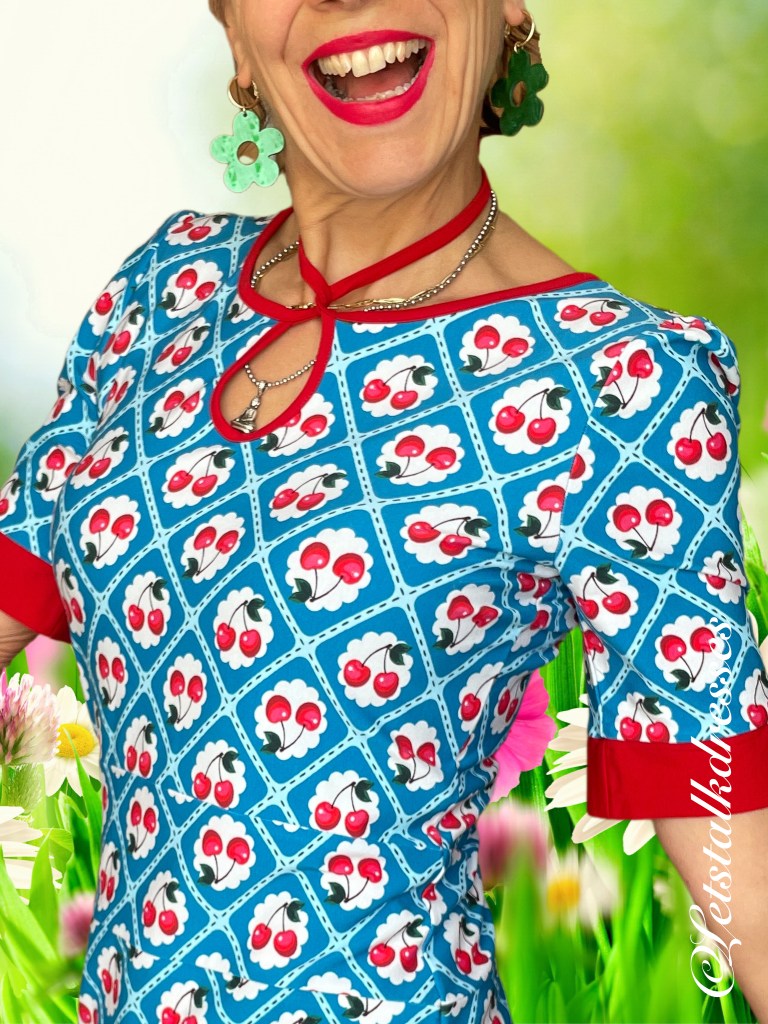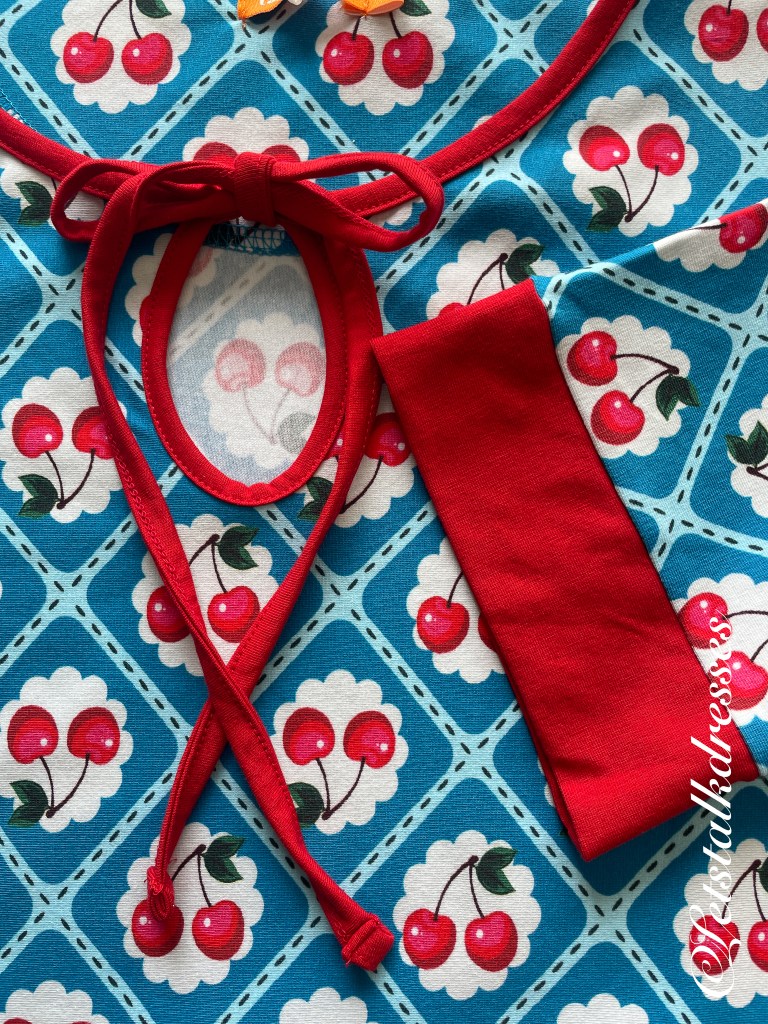Zowel de manchetten van de mouwtjes als de halslijn en striklint zijn gemaakt van een felrood gekleurd tricot. Steekt mooi af bij het blauw maar matcht met de kersen!