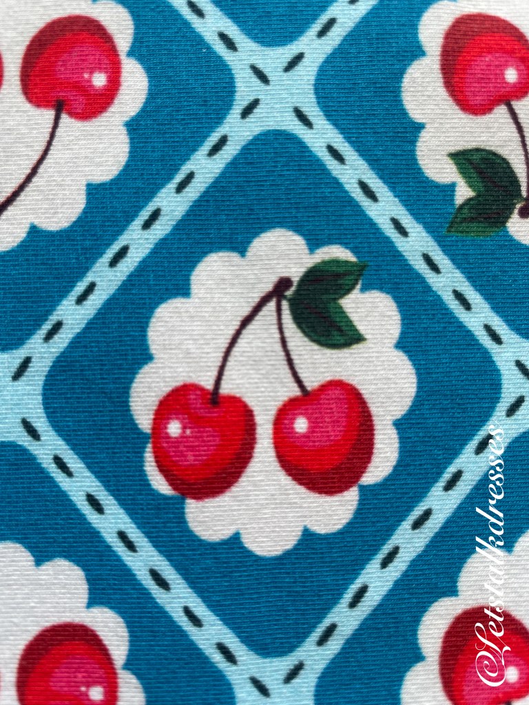 De print ‘Cherry’ van Tante Betsy is een lekkere frisse ruitvorm in de kleuren helderblauw met een wit geschulpt hart waar de kersen om en om schitteren. De blauwe ruiten hebben een lichtblauwe lijn eromheen met een donkergroene streepjeslijn.