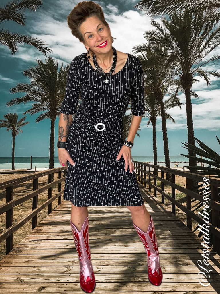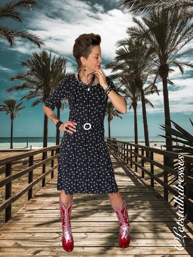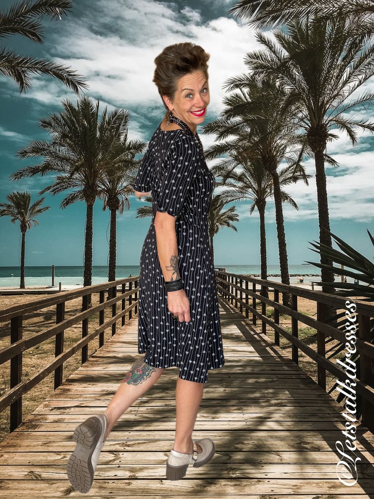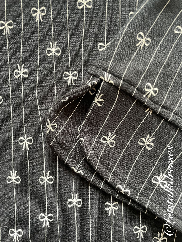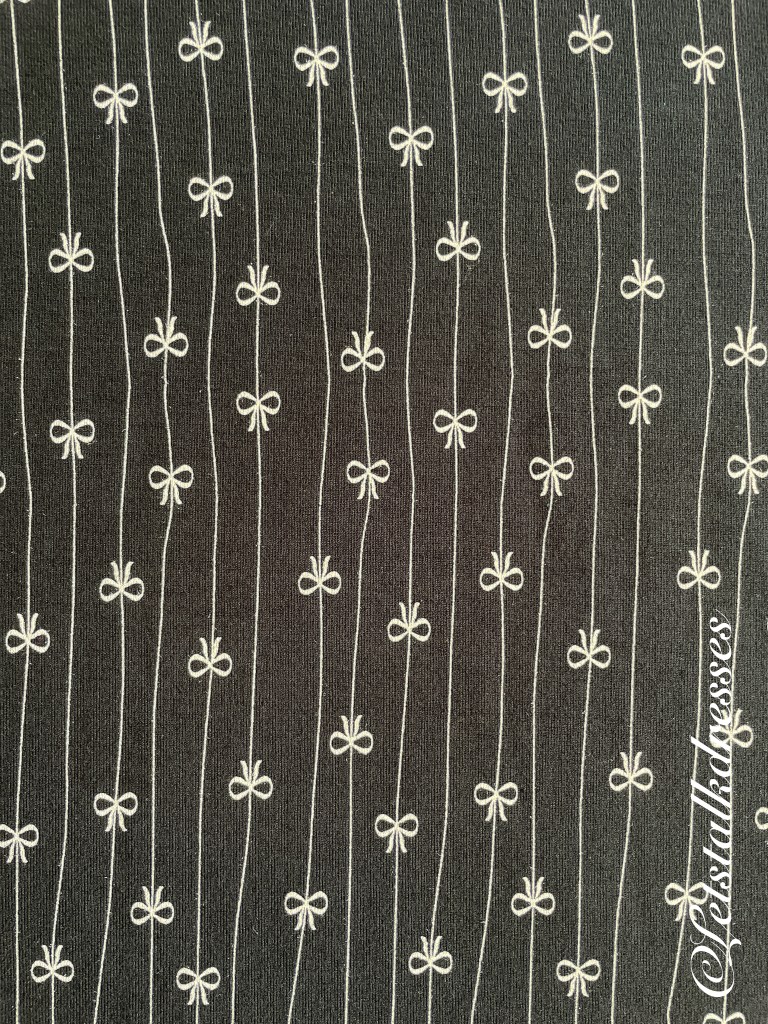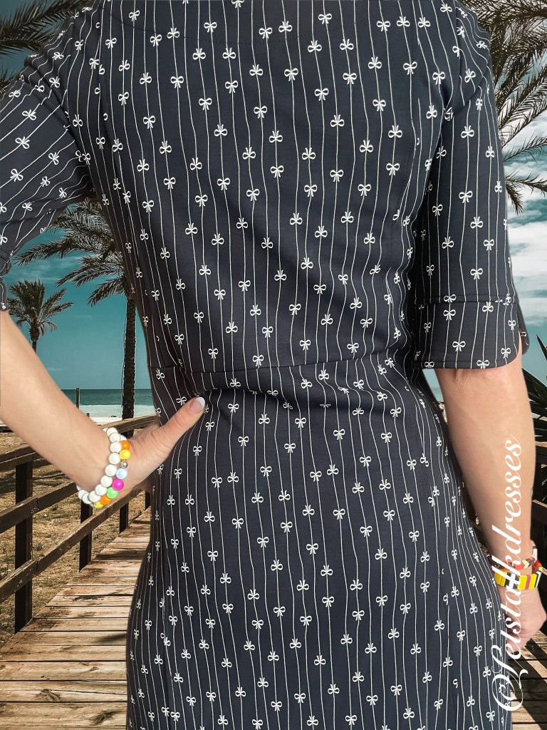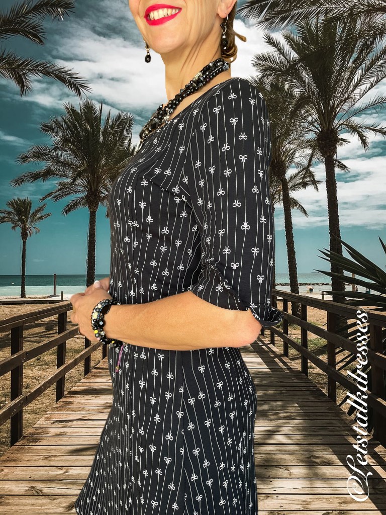 En nou ik dit toch aanstip: iedereen weet dat zwart een zeer goed afkledende kleur is toch? Dus is deze mooie dress ook zwart! 3x een afkledende feature aan deze nieuwe Dress!! What’s not to like?? Om hem toch echt Tante Betsy speels te houden, heeft Alisa er geinige strikjes op gemaakt, gevangen in het krijtstreepje. Ook leuk, die strikjes zitten om en om: op de kop en gewoon. Het maakt de jurk verre van saai!