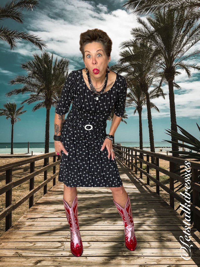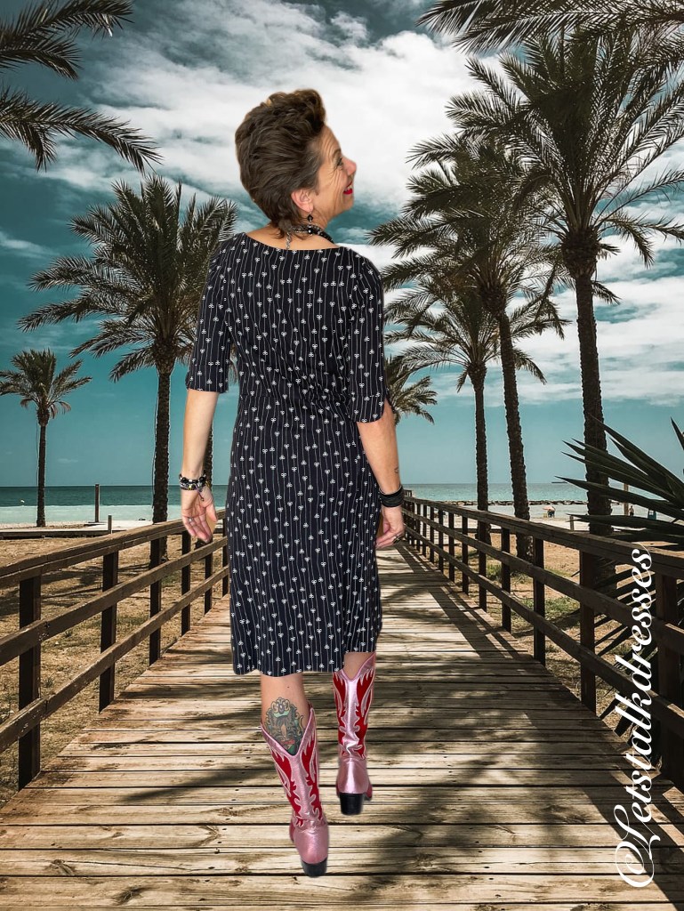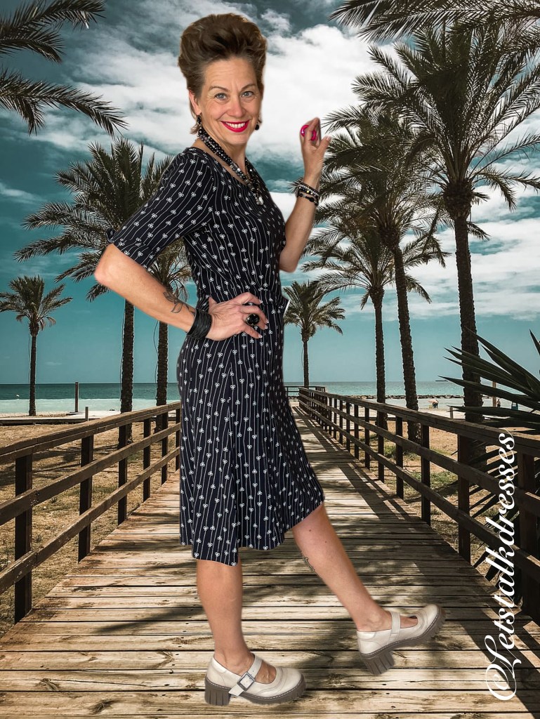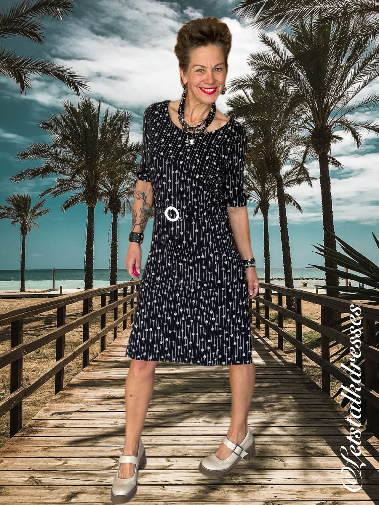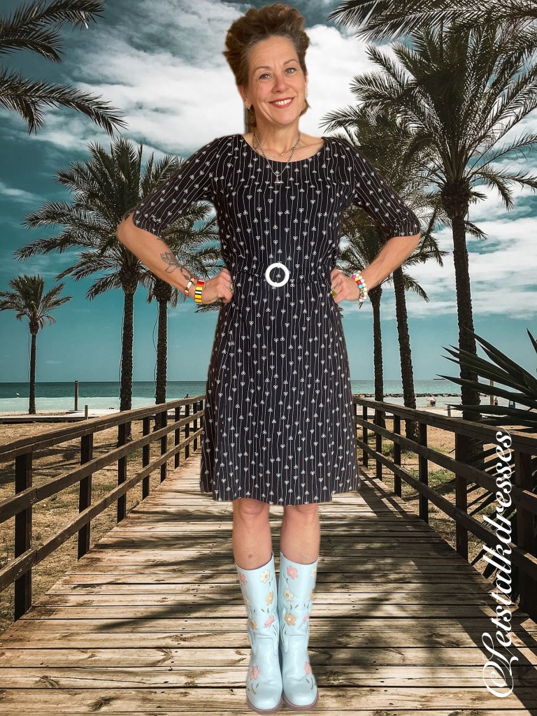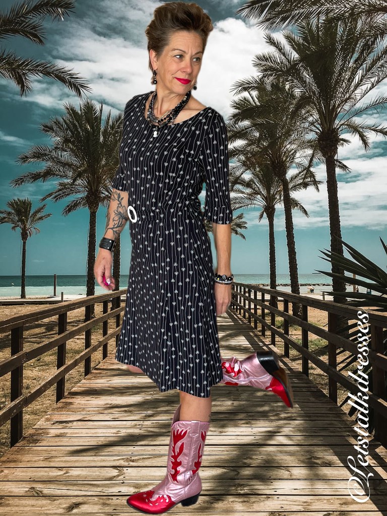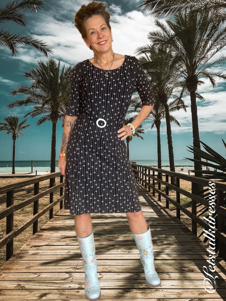 En nou ik dit toch aanstip: iedereen weet dat zwart een zeer goed afkledende kleur is toch? Dus is deze mooie dress ook zwart! 3x een afkledende feature aan deze nieuwe Dress!! What’s not to like?? Om hem toch echt Tante Betsy speels te houden, heeft Alisa er geinige strikjes op gemaakt, gevangen in het krijtstreepje. Ook leuk, die strikjes zitten om en om: op de kop en gewoon. Het maakt de jurk verre van saai!