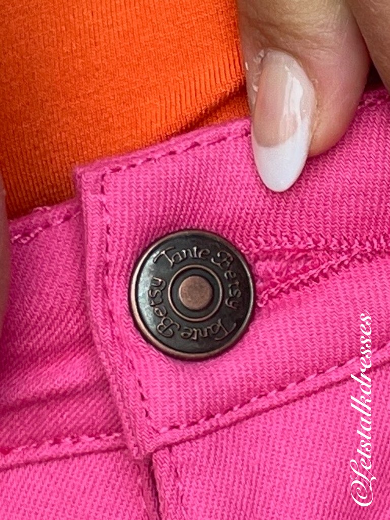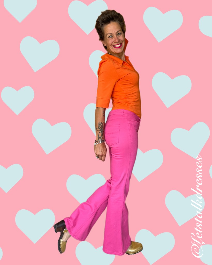 En ja, dan kan een effen jeans natuurlijk niet achterblijven hè?! En Tante zou Tante niet zijn als zij er eentje zou ontwikkelen die ook qua kleur perfect in de collectie past! De effen bootcut jeans is dus gemaakt in 3 gave kleuren: rood, groen en roze. Ik mag jullie de pink-versie laten zien.