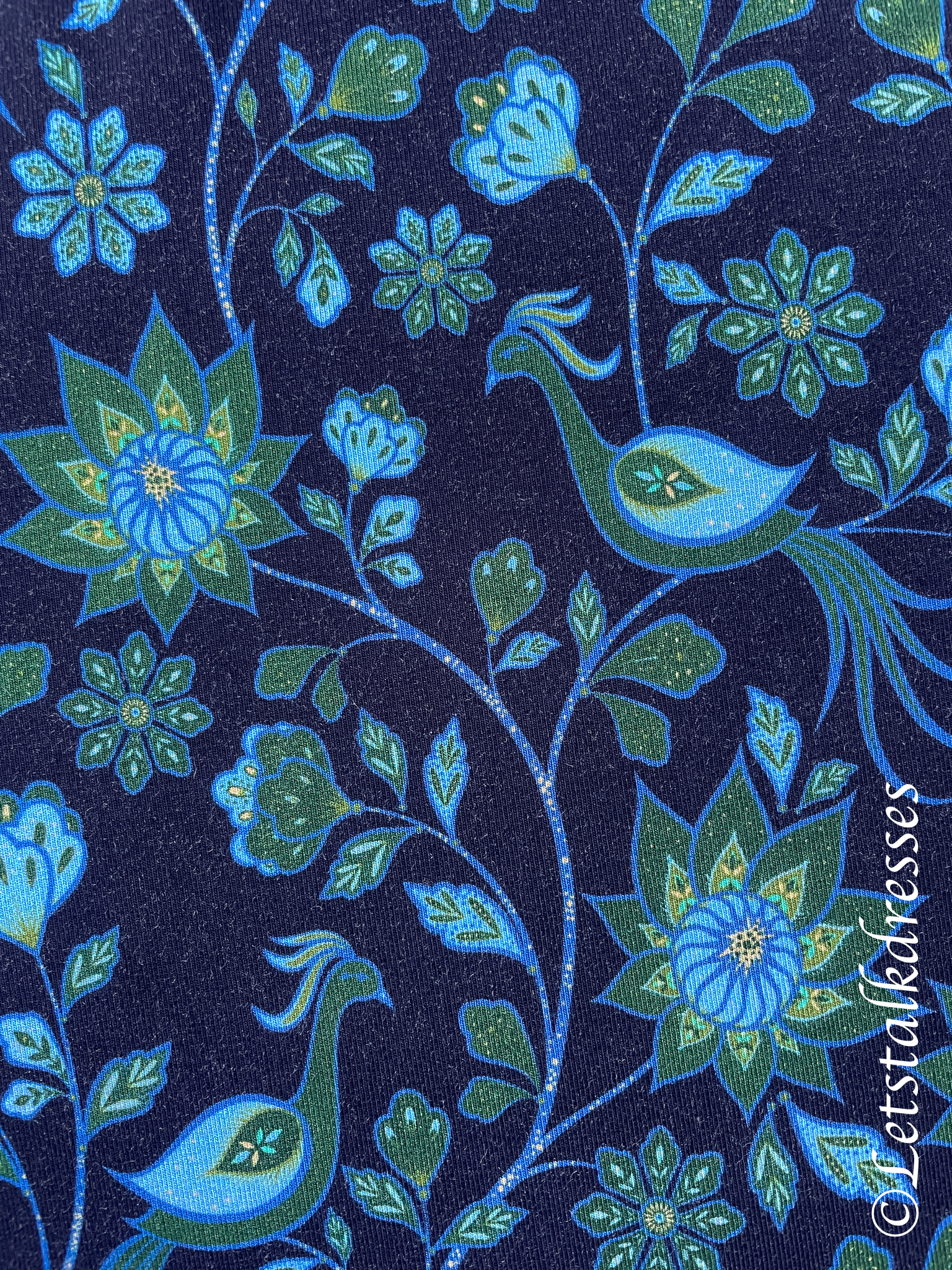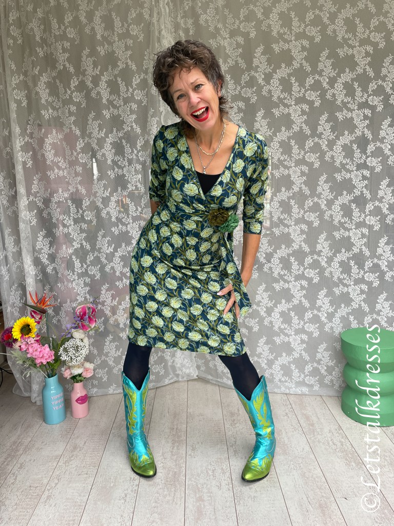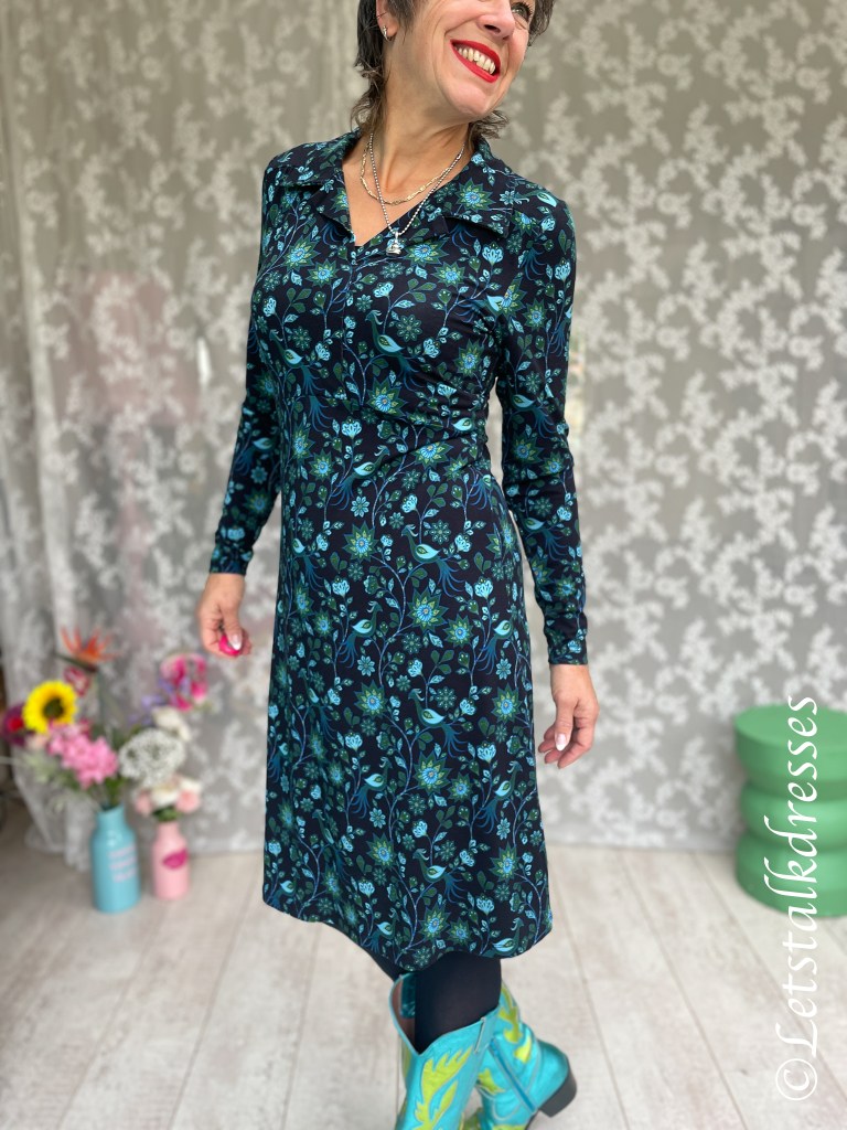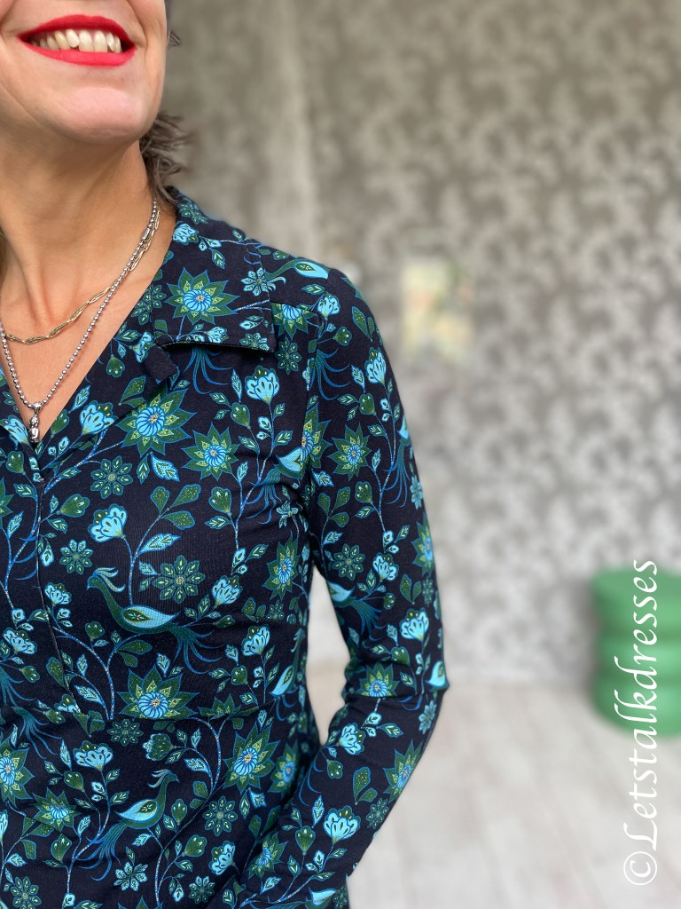Ik heb ervoor gekozen de Collardress Marilyn te laten zien in de print Retro Birds Green. Ik vind dit wel een verwarrend gekozen kleurnaam. Als je de print van een afstandje bekijkt oogt het absoluut blauw. Maar zoals je ziet, zijn de vogels overwegend groen dus vandaar de keuze van naam.