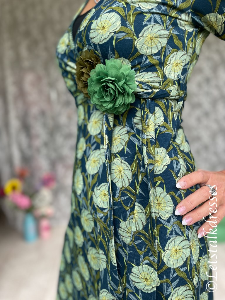 Bij het fotograferen van deze blog was ik al bezig met de roosjes van Urban Hippies. En toen kwam er een Eureka! momentje: Ik knipte de roosjes achter de voorste overslag en over de stoffen ceintuur… en zie daar: De band blijft prachtig zitten en je hebt meteen een eyecatcher van heb ik jou daar op deze mooie jurk!!! Die moest ik toch echt nog even aan jullie laten zien.