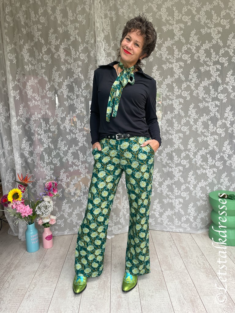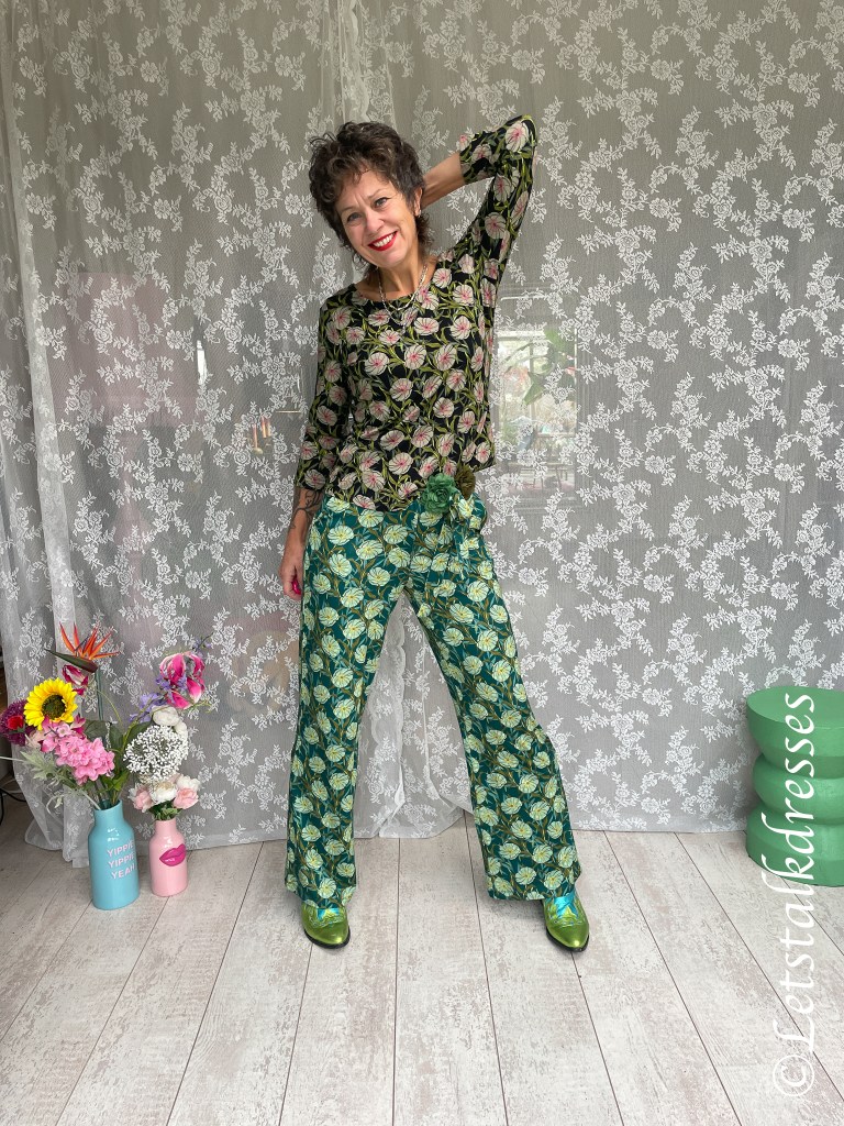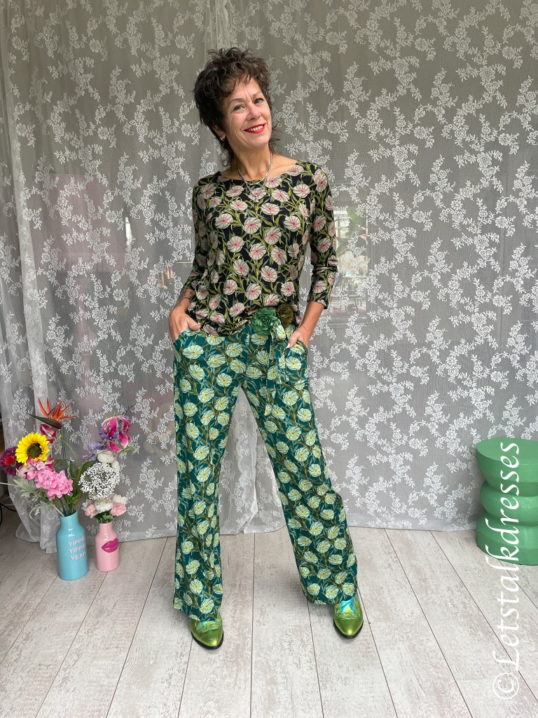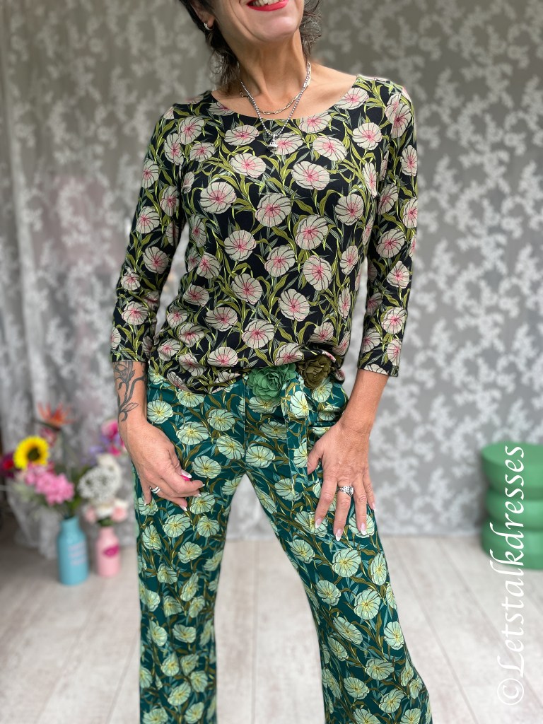 Deze print, Foliage Flowers Petrol, is prachtig te combineren met dezelfde print in andere kleuren. Ook kan je de print combineren met een shirt uit de plain serie. Ik koos hier bijvoorbeeld voor Top Suzy Black. Dat maakt de print/pants gewoon iets zakelijker.