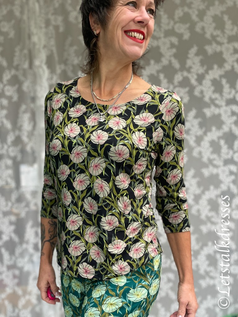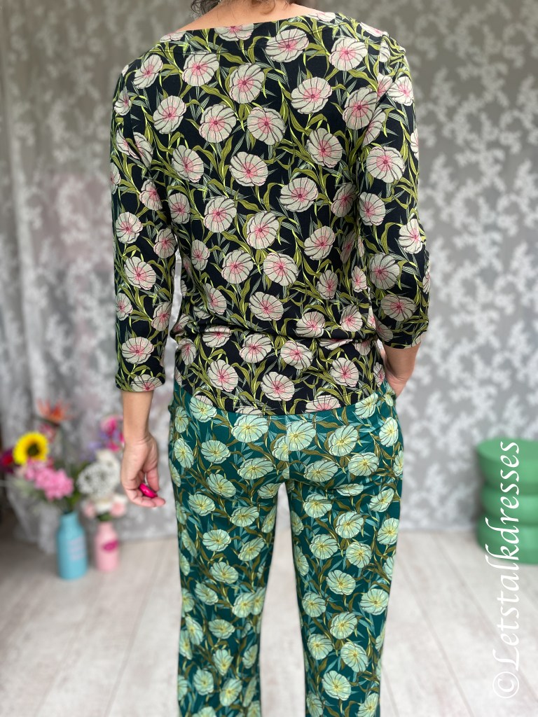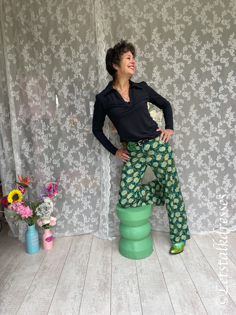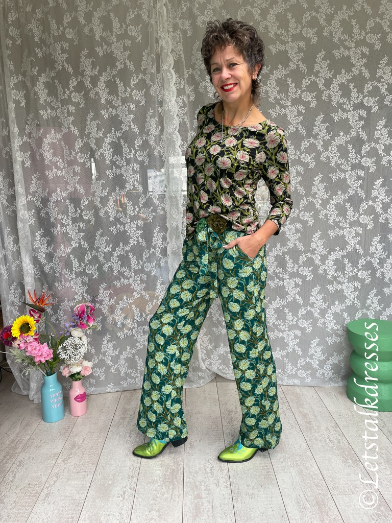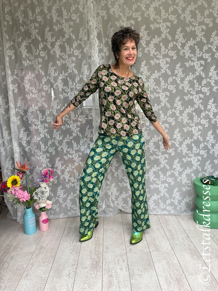 Deze print, Foliage Flowers Petrol, is prachtig te combineren met dezelfde print in andere kleuren. Ook kan je de print combineren met een shirt uit de plain serie. Ik koos hier bijvoorbeeld voor Top Suzy Black. Dat maakt de print/pants gewoon iets zakelijker.