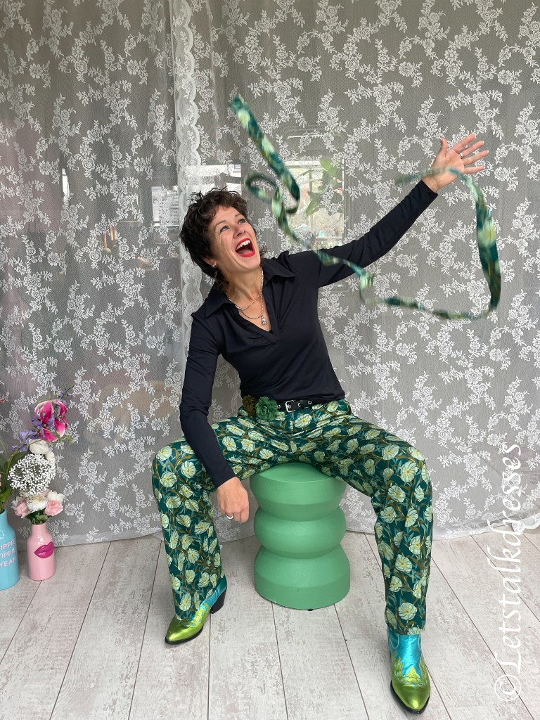 Top Loosy is ook in veel printjes uitgekomen. Nu koos ik voor een tegenovergestelde kleur in de Foliage, maar je kan ook dezelfde kleur kiezen. Daar wordt de set iets rustiger van en creëer je een soort jumpsuit. De top kan je in de pants dragen, er overheen maar ook met een French Tug. Dat laatste vind ik persoonlijk het mooist. Dan kan de strik van de ceintuur ook lekker shinen en kijk eens hoe leuk je zo’n broekband kan fluffen met een paar stoffen bloemen van http://www.urbanhippies.nl?!