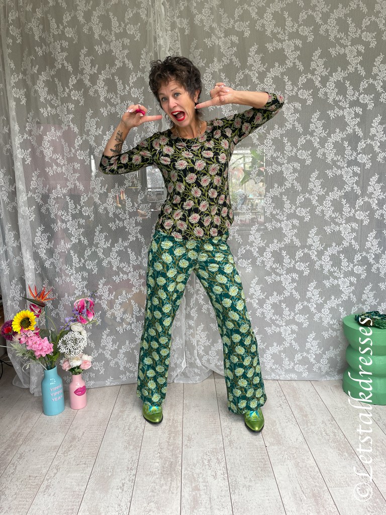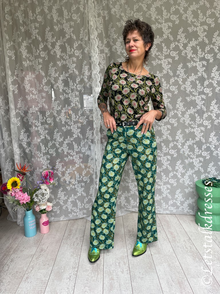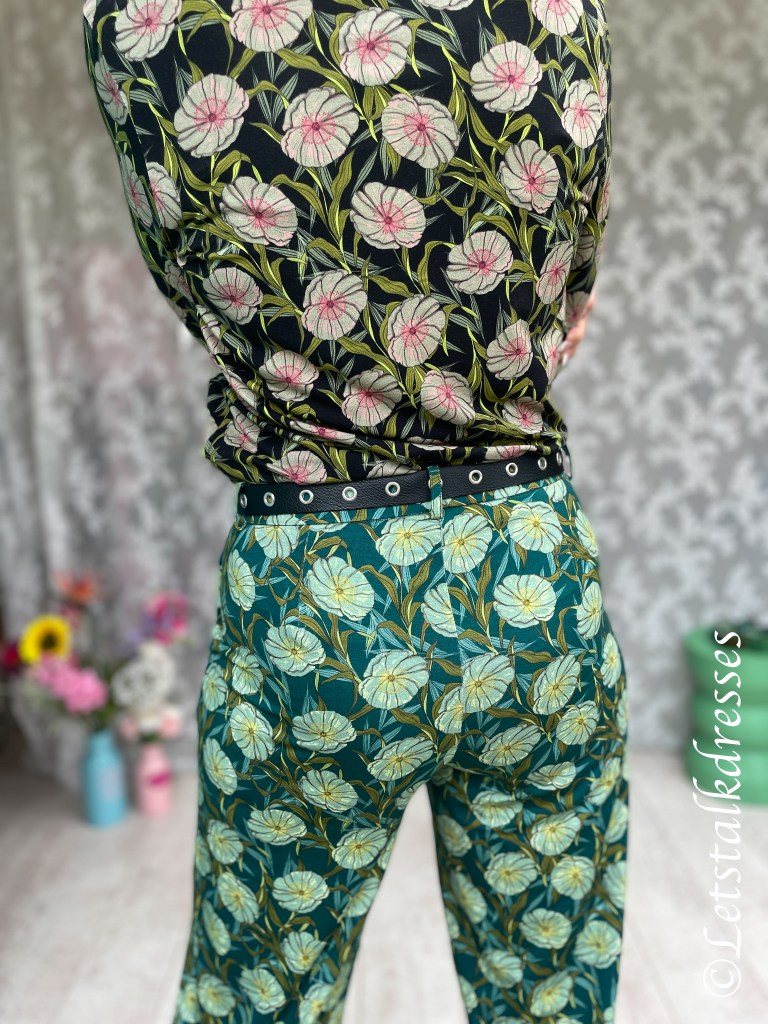 Sue Trousers laat ik hier zien in de Foliage Flower Petrol: een heerlijk warm blauwe tint die dat mooie glansje heeft wat we zo goed kennen van het viscose EcoVero. Deze print is uitgekomen in 4 kleuren: Red (ik liet Skirt Diana al zien), Navy, Black & Petrol. In deze blog komen de 3 andere kleuren dus ook goed aan bod!