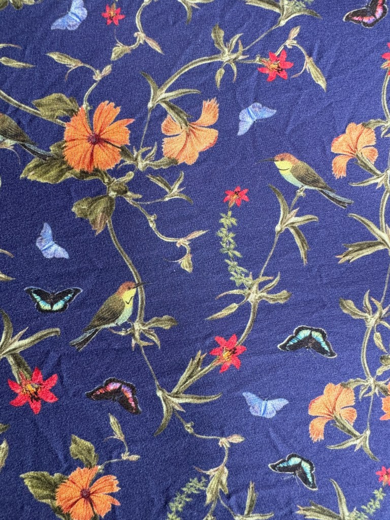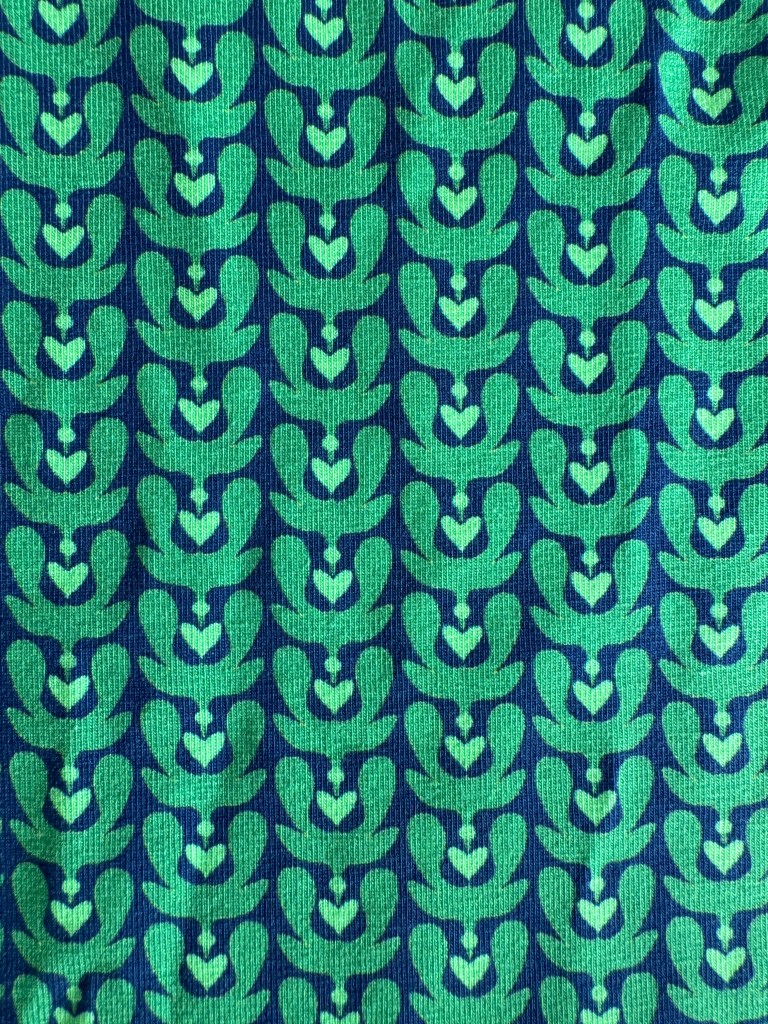 De print Lovely Dovey is lief klein printje van een soort vliegend duifje (gebruik een beetje fantasie lieve lezertjes) met een hartje in de snavel. Het zijn 2 tintjes groen met een donkerblauwe achtergrond. Ik vind het wel geinig. Niet echt bohemian maar wel verrassend lichter en luchtiger in het echt dan op de productiefoto’s.