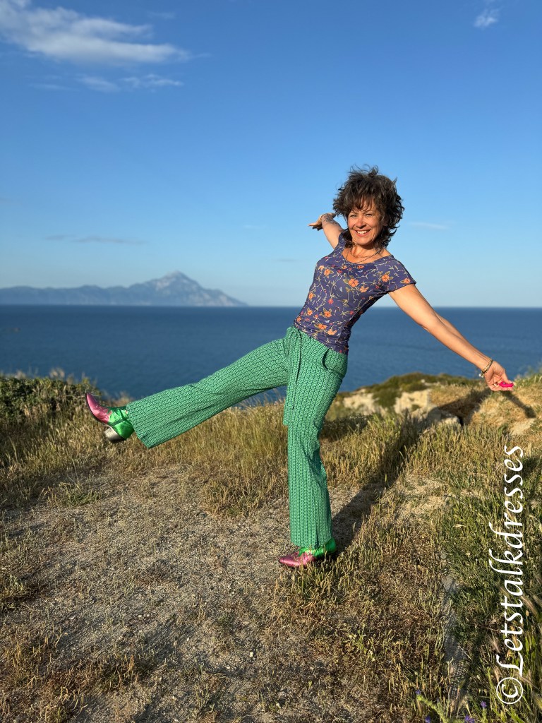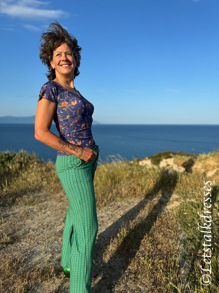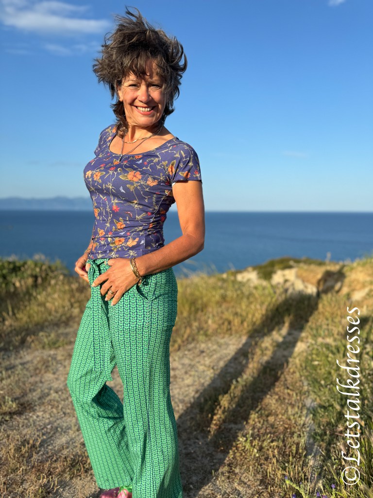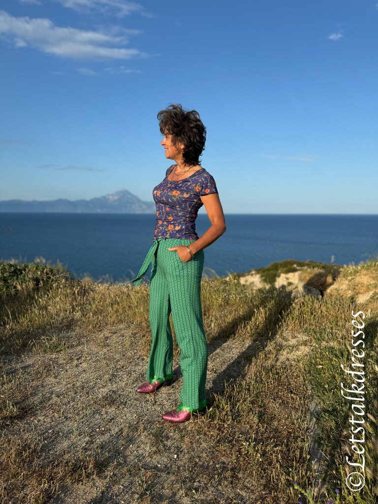 De Sue broeken die ik je nu laat zien zijn gemaakt van Biokatoen (print Lovely Dovey) en van Micromodal (kleur Plain Green). Biokatoen is een wat steviger tricot dan micromodal. Dat maakt dat ie net iets anders valt dan micromodal en ecovero. Micromodal is weer zachter aanvoelend dan de ecovero waar LaLamour mee werkt.