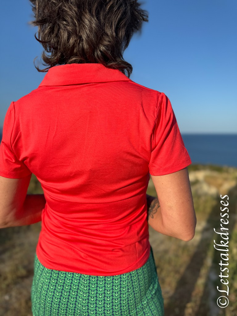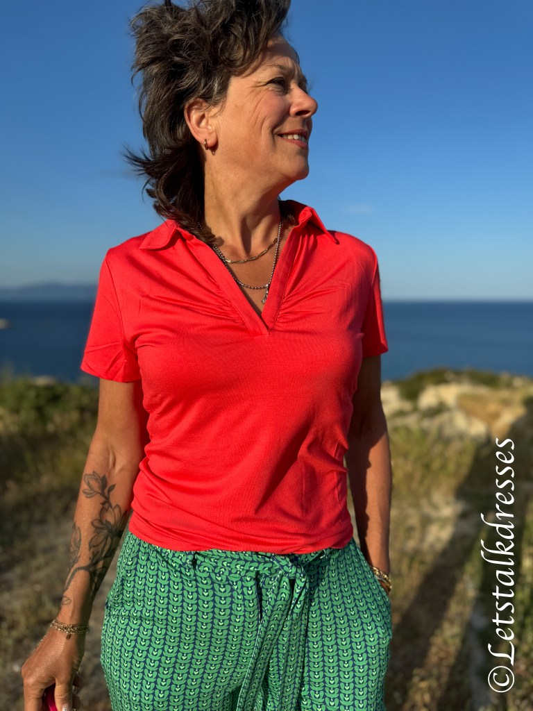 De kleur Poppy is een echt felrode tint die heel warm is, neigend naar oranje maar dat is het dan toch weer net niet. Zo gecombineerd op de print Lovely Dovey, knalt hij er supergoed uit! het fleurt de hele outfit op, waar de Butterfly Top hem iets ingetogener hield.