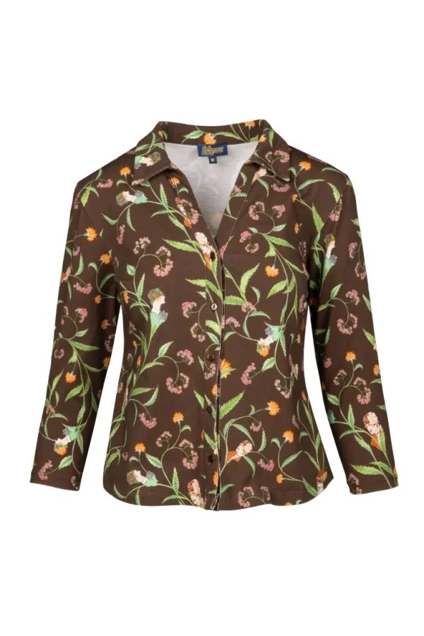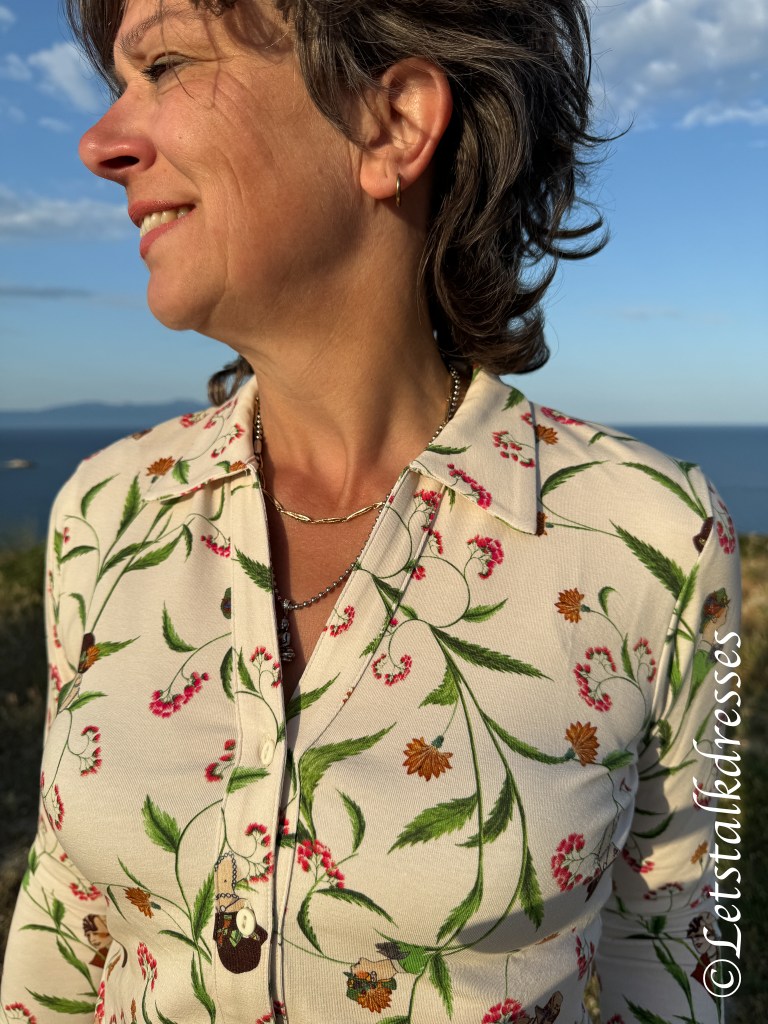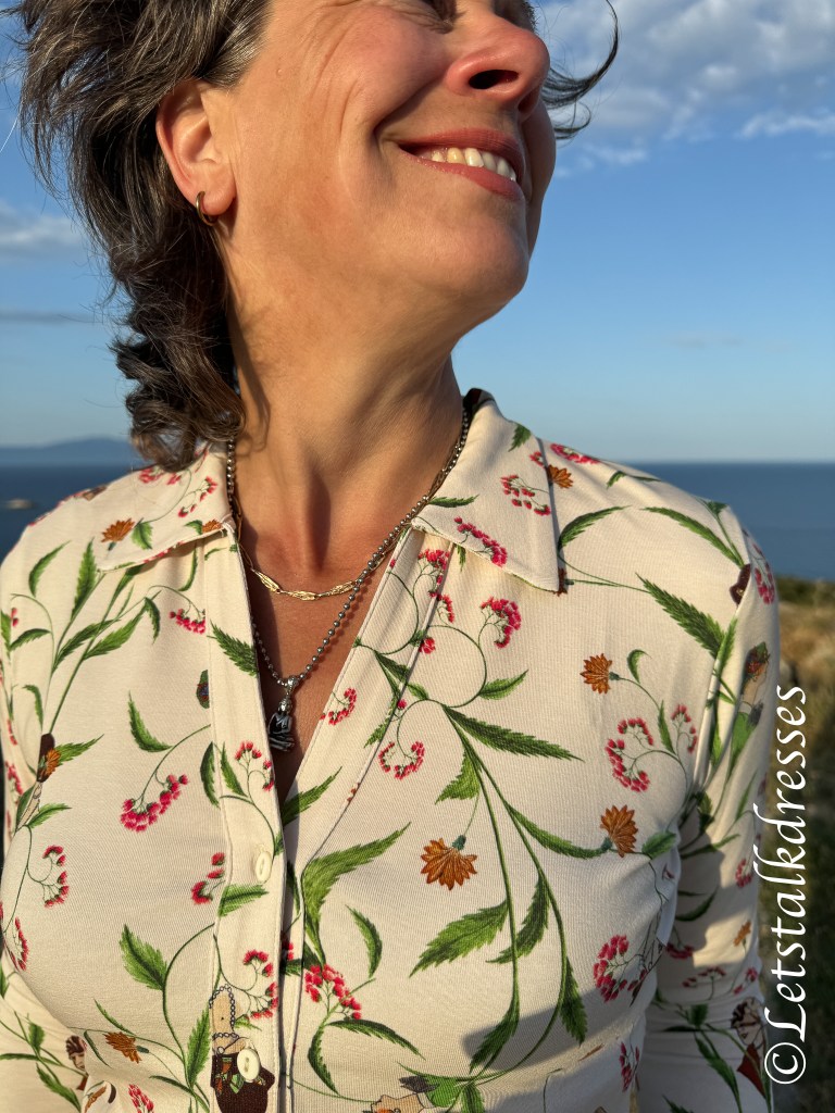 De vernieuwing zit ‘m vooral in de kraag en de halslijn. Bij een retrokraagje verwacht je meestal een reverskraagje maar bij de LaLamour blouses is deze weg. Nu valt de blouse vanaf de laatste knoop, net voorbij de buste, in een V-halsje en heeft het een mooi glad boordje. Geen extra kraagjes, geen gefrut. Ik vind dat echt super slim. En mooi want nu valt er niet telkens een kraagje dubbel o.i.d..