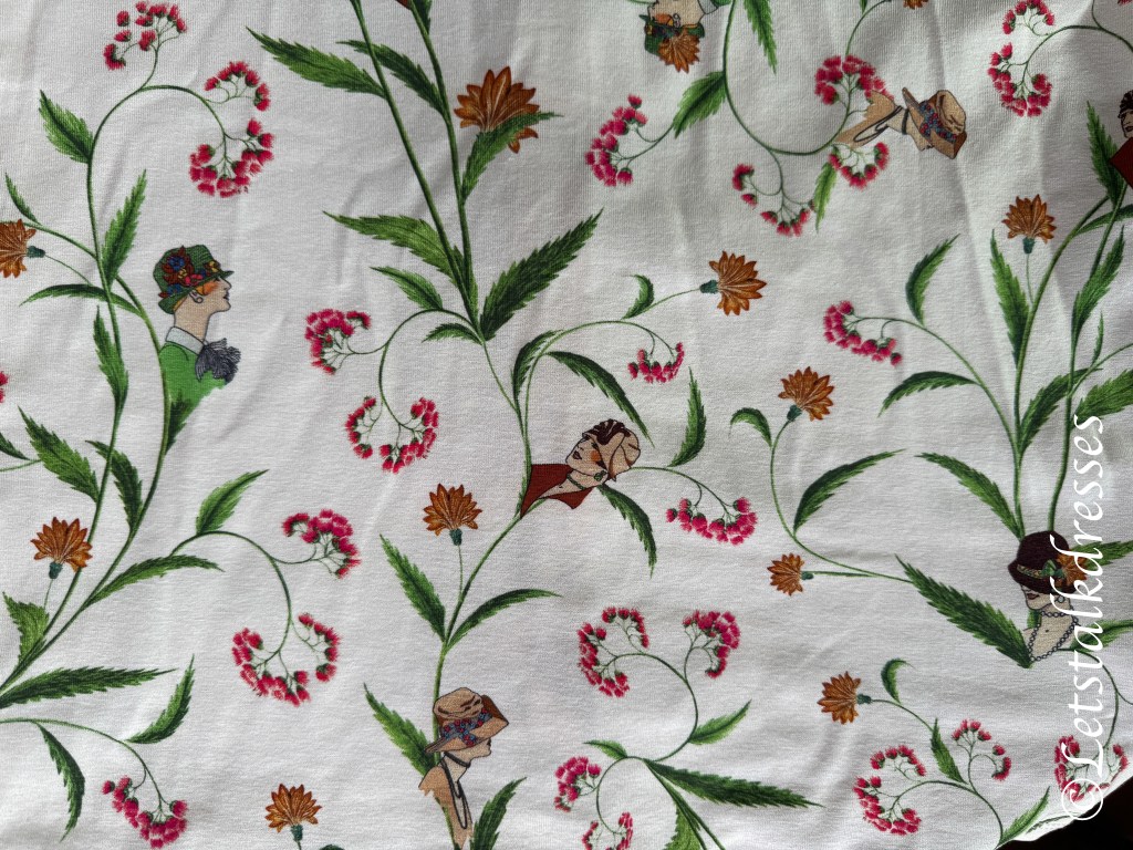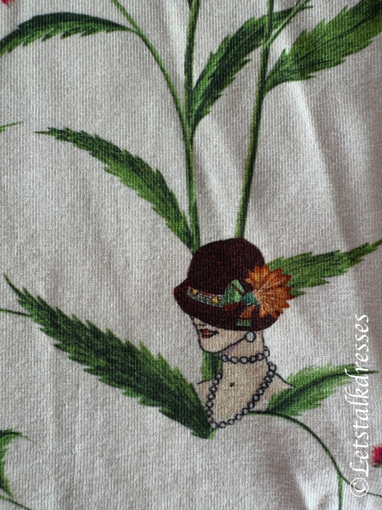 De fijne ranke luchtige bloemen houden de elegante vrouwenkopjes vast en laten ze dansen op de stof. De kleuren zijn warm en diep. De bloemetjes zijn bijna poederig geschilderd en zelfs op de hoedjes van de dames zie je nog boeketjes.