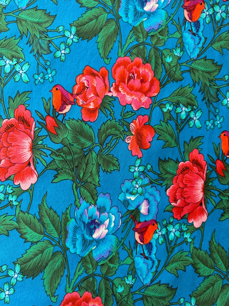 Een bijzonder vrolijke print met echt hele heldere kleuren, is Print Robin Blue. De basis is van een echt felle blauw, bijna KLM blauw. Op die blauwe achtergrond staan weelderige rozen in roze rode oranje en ook blauwe tinten. Ook zijn er kleine blauwe bloemetjes kronkelend tussen het groene gebladerte. En als je denkt dat je er bent, piepen er plots ook nog allerlei roodborstjes tevoorschijn! Je snapt wel dat deze print een echte topper is!