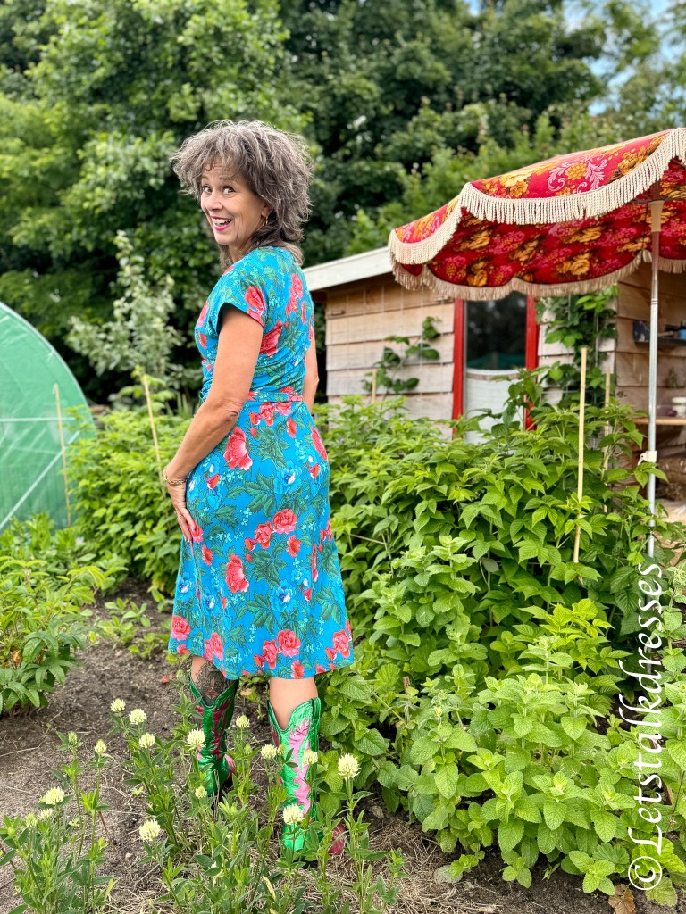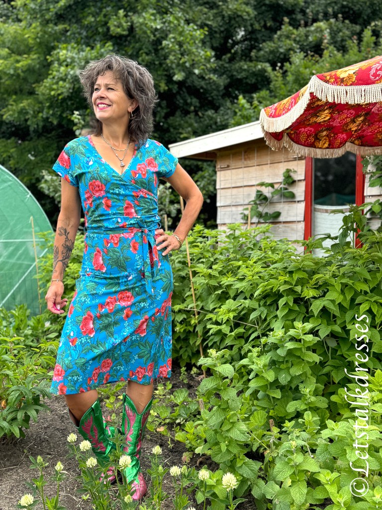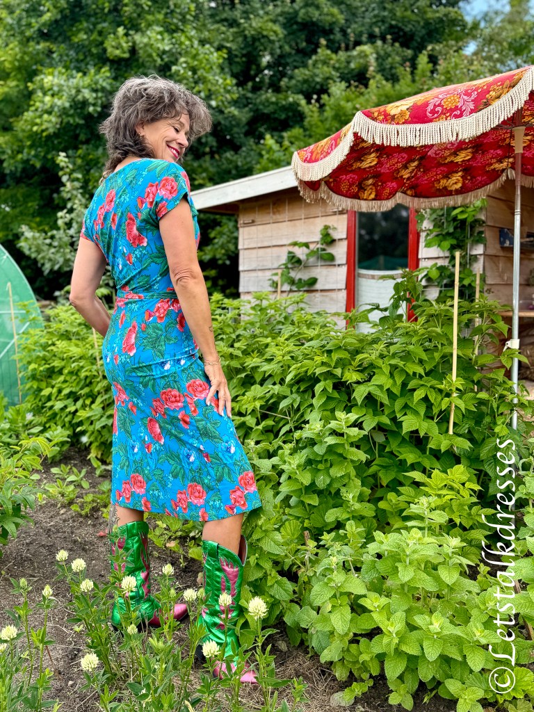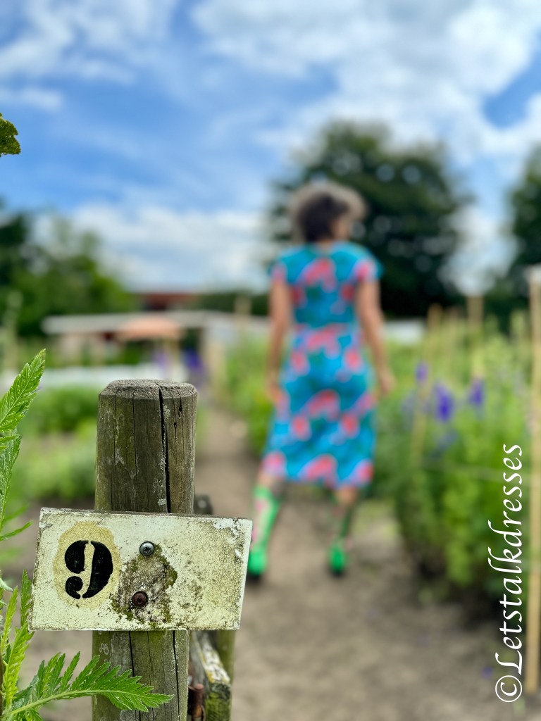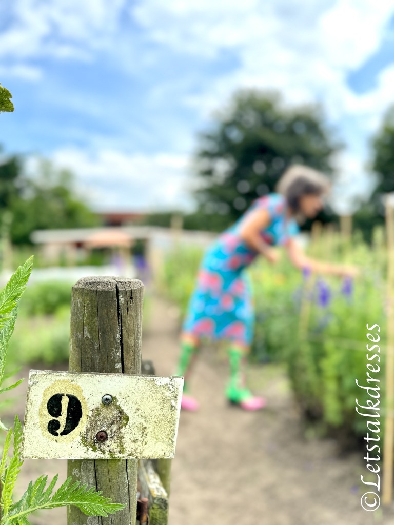 En ja, waar kan je zo’n kleurrijk jurkje nou beter laten zien dan in een heuse pluktuin! Niet zomaar een pluktuin natuurlijk: Tuin9 in Zutphen is een start-up van Eline die na een zeer bewogen en avontuurlijk leven nu is geland in haar prachtige bloementuin. Hier gaat zij uiteindelijk samen met mensen die herstellen van een burn-out of met een andere afstand tot de arbeidsmarkt op een biologische duurzame methode bloemen kweken die door klanten zelf geplukt worden en/of als boeketten worden verkocht.