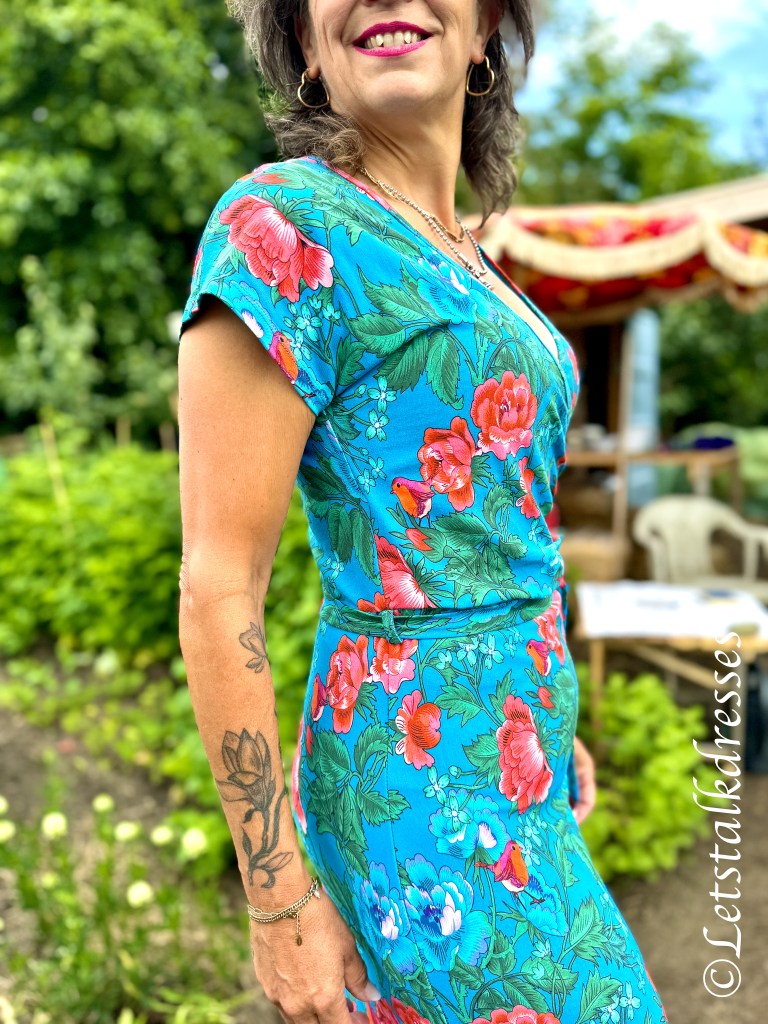 Het overslag halslijntje is niet te diep maar ook niet echt hoog. Mijn hemdje die ik droeg (want omkleden deed ik op de tuin zelf hahaha) piept er af en toe bovenuit. Je kan deze jurk prima zonder hemdje dragen als je het niet erg vindt een stukje cleavage te laten zien.