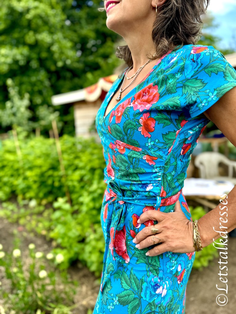 Dress Delia is een cross-over jurkje met aangeknipte korte mouwtjes, mooi geplooid op den buik en met een eenvoudige gerende rok. Nou. Ik weet niet hoe het met jullie coupeuse skills is, maar dat is dus een vakterm die mij al jaren hoofdbrekers bezorgd: een gerende rok??? Na wat gepuzzel en gezoek blijkt een gerende rok één van de eenvoudigste rokken te zijn: de onderkant is wijder dan de taille. Hij zit strakker op de heup en bestaat uit twee panden… Nou, dat klopt allemaal wel.