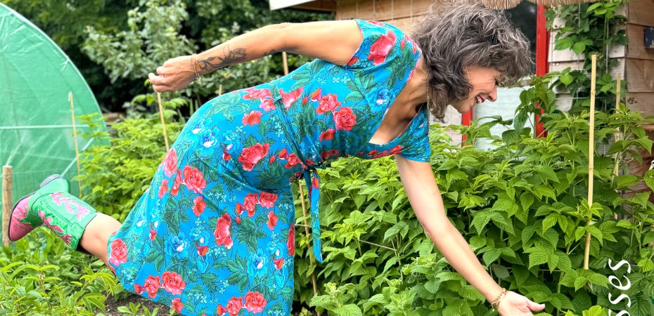 En ja, waar kan je zo’n kleurrijk jurkje nou beter laten zien dan in een heuse pluktuin! Niet zomaar een pluktuin natuurlijk: Tuin9 in Zutphen is een start-up van Eline die na een zeer bewogen en avontuurlijk leven nu is geland in haar prachtige bloementuin. Hier gaat zij uiteindelijk samen met mensen die herstellen van een burn-out of met een andere afstand tot de arbeidsmarkt op een biologische duurzame methode bloemen kweken die door klanten zelf geplukt worden en/of als boeketten worden verkocht.