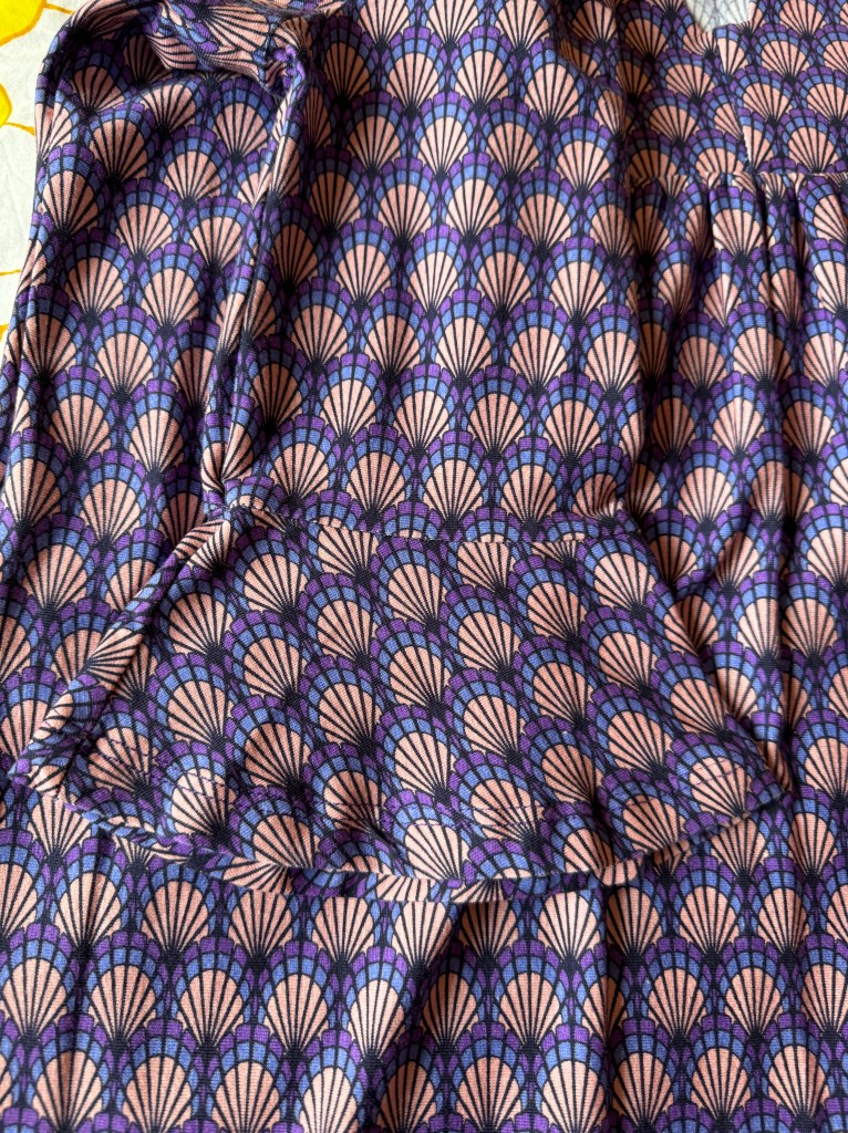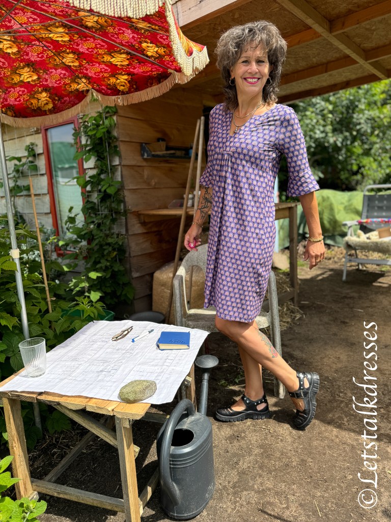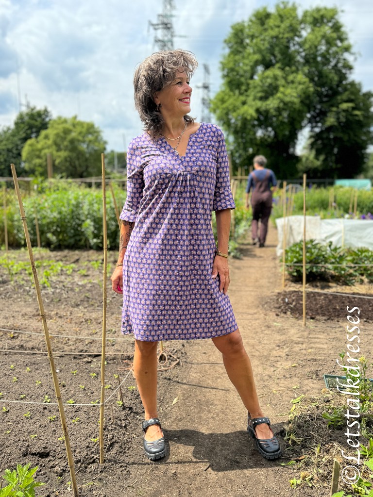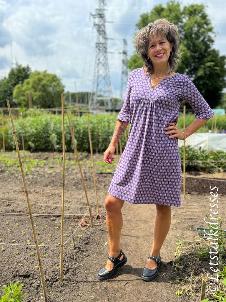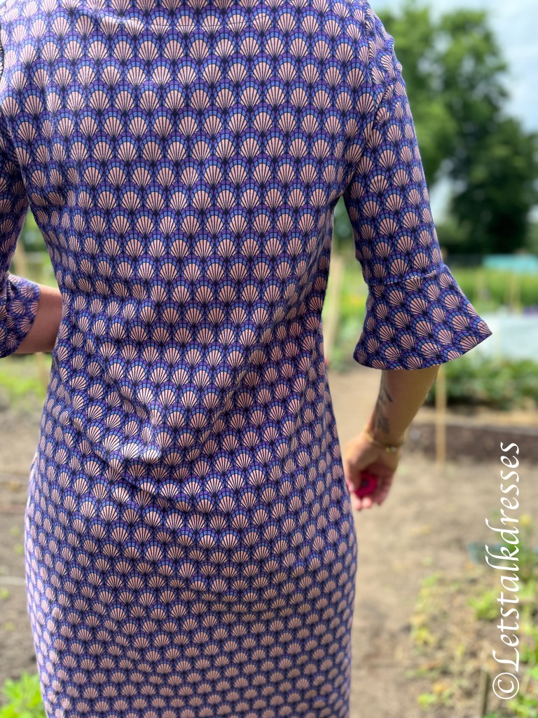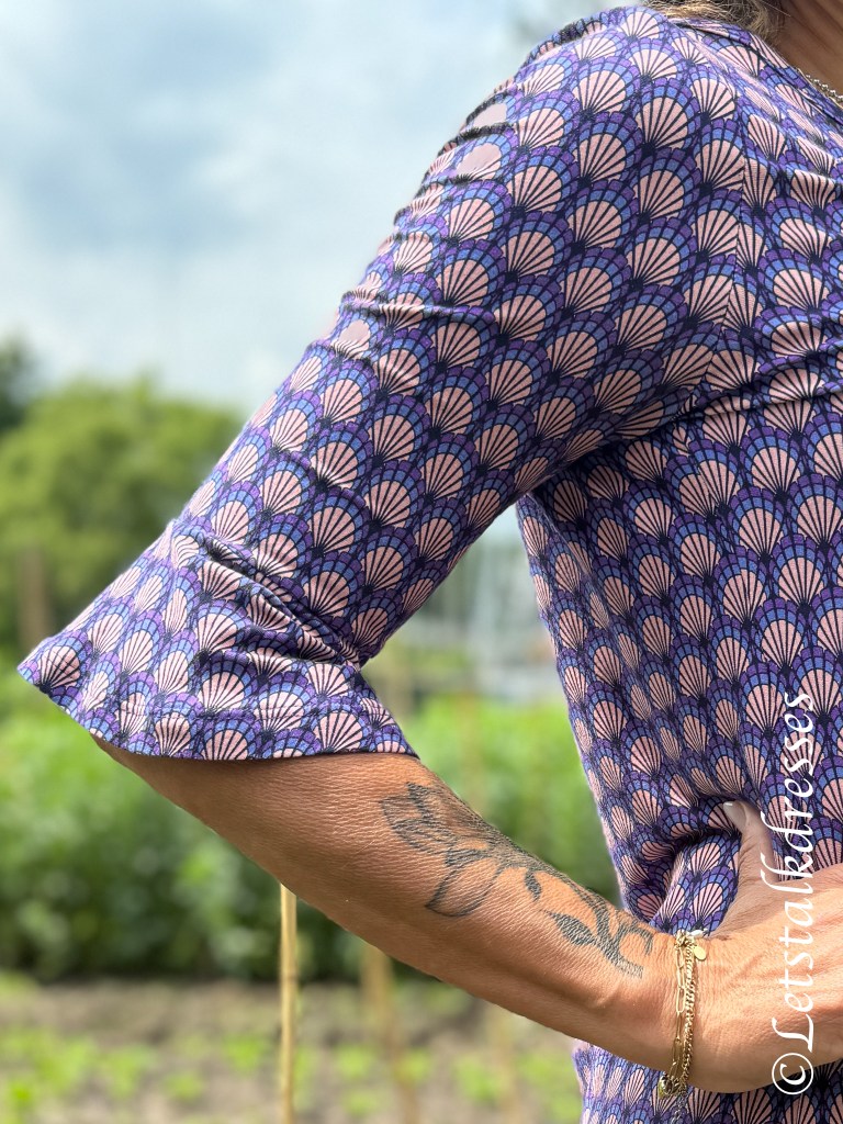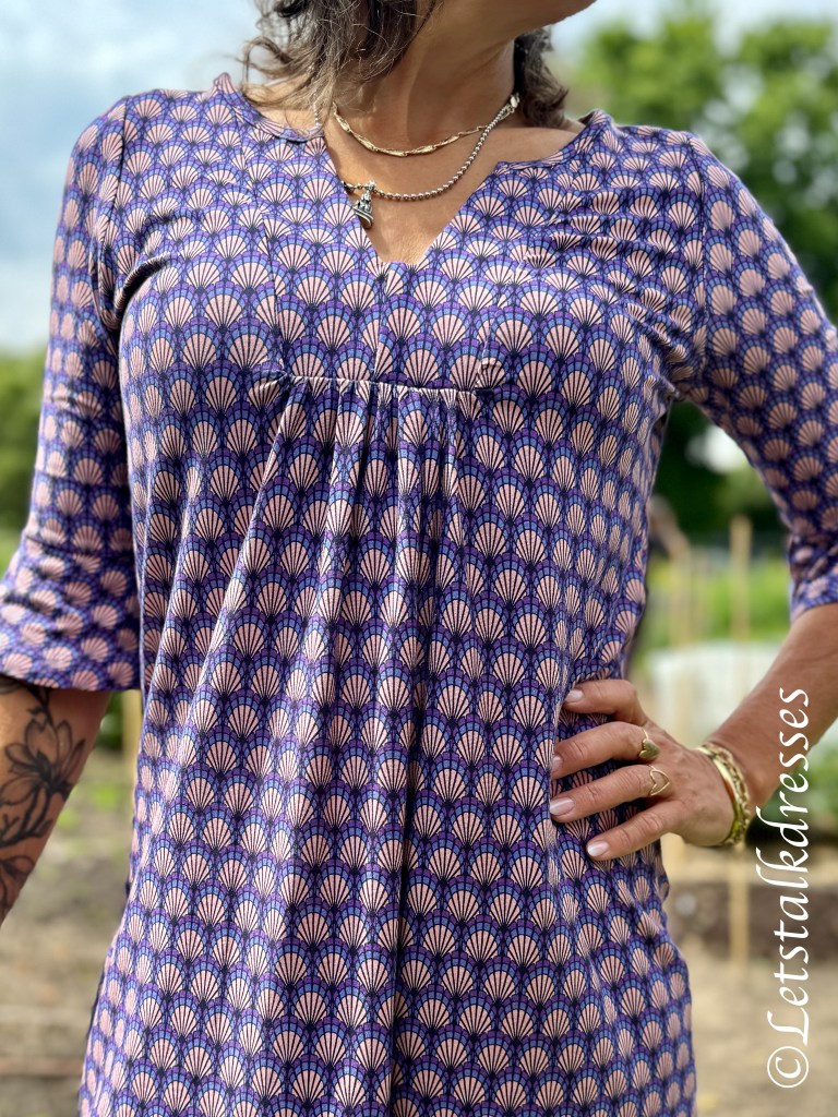 Op dit moment heeft Tante Betsy de Tunic Dress in 3 uitvoeringen in deze zomercollectie: Print Shell Purple en Green + in Starfish Purple. Allen zijn gemaakt in de 2e drop en zijn van het katoenen jersey wat in de breedte minder rek heeft maar zeker wel heerlijk dun zomers aanvoelt. En, alhoewel het label het niet laat zien, is mij door Tante Betsy verzekerd dat het wel degelijk biokatoen is.