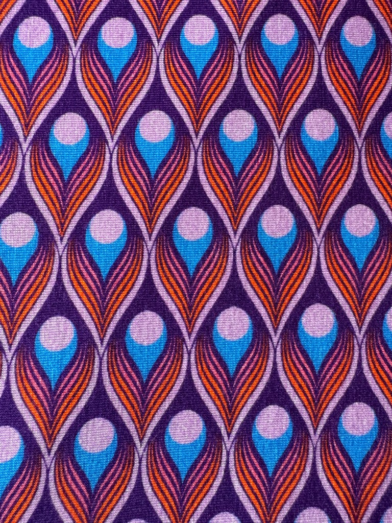 De gekozen kleuren zijn wat koeler: Er zijn lila tintjes, paars, lichtblauw oranje en roze. In weze een heel drukke print maar van een afstand komt door de kleine vorm het toch weer rustig over.
