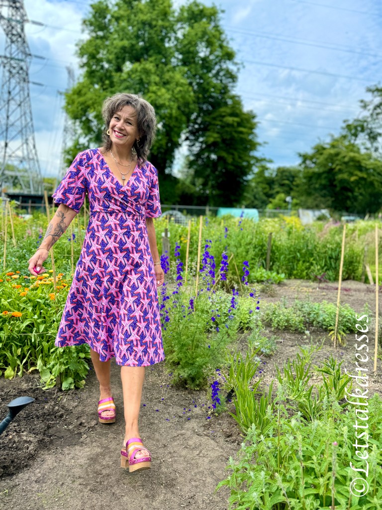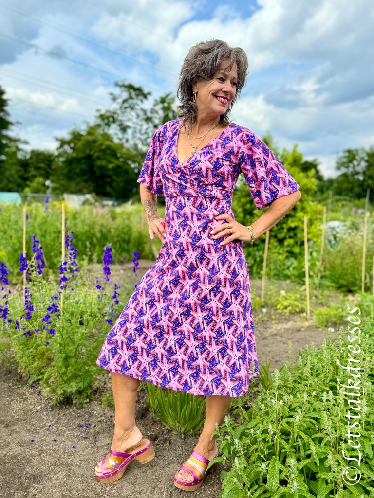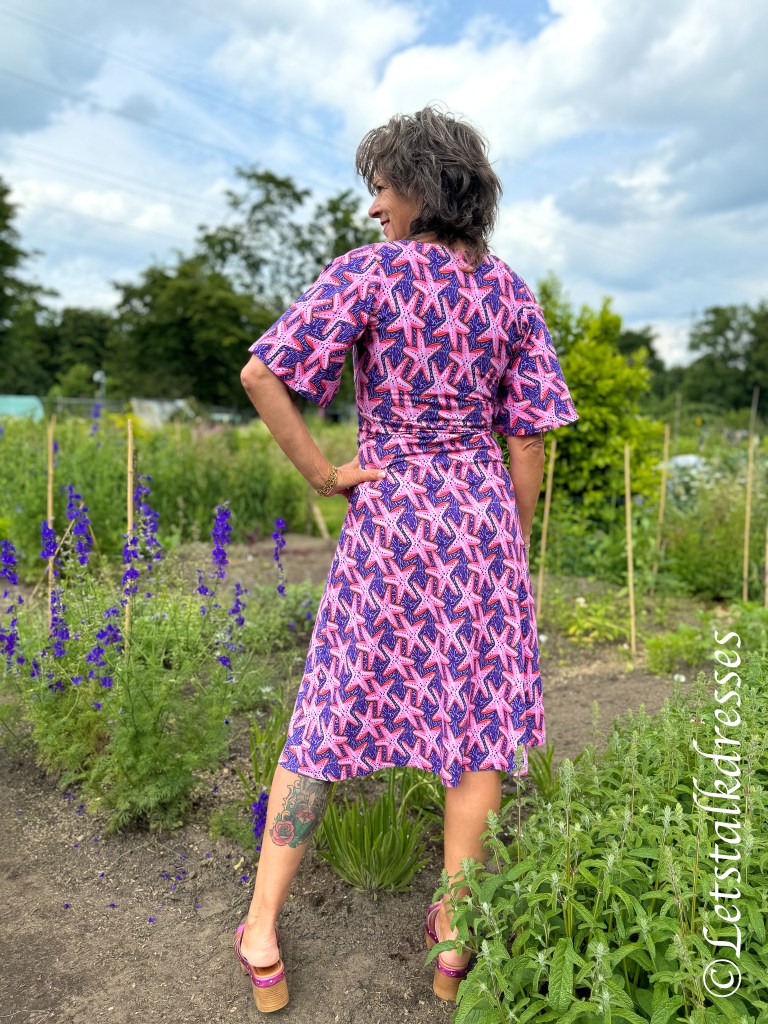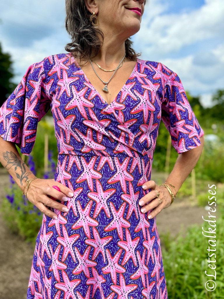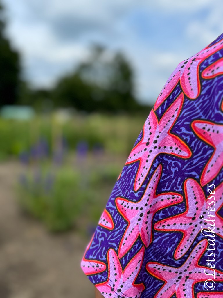 Ik heb gekozen om deze dress te laten zien in de print Starfish. Een vrolijk gekleurde print van zeesterren en zeewater. De zeesterren hebben een kleurenmix van roze tinten, zwarte stippen en een oranje + rode randje. De achtergrond is een blauw/paarse tint, gecombineerd met lichtblauw/lila vlekken. Het maakt de print levendig en lekker fris.