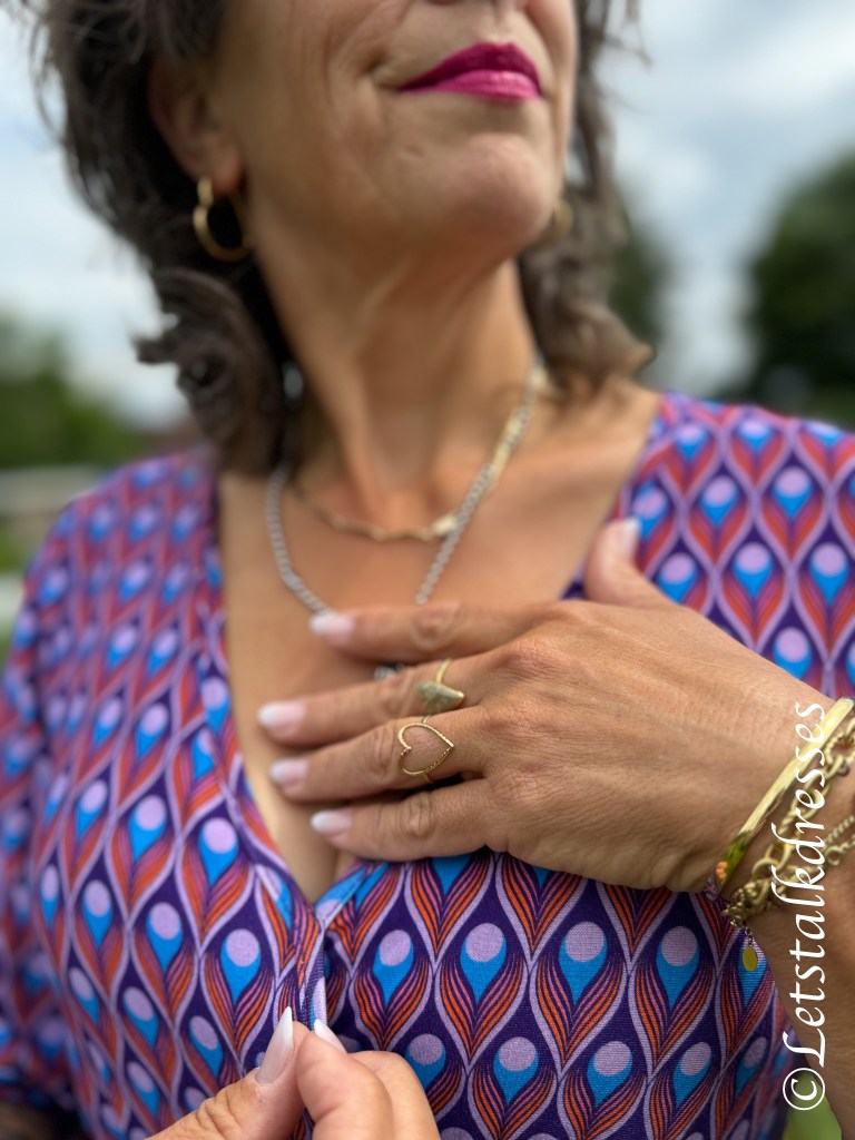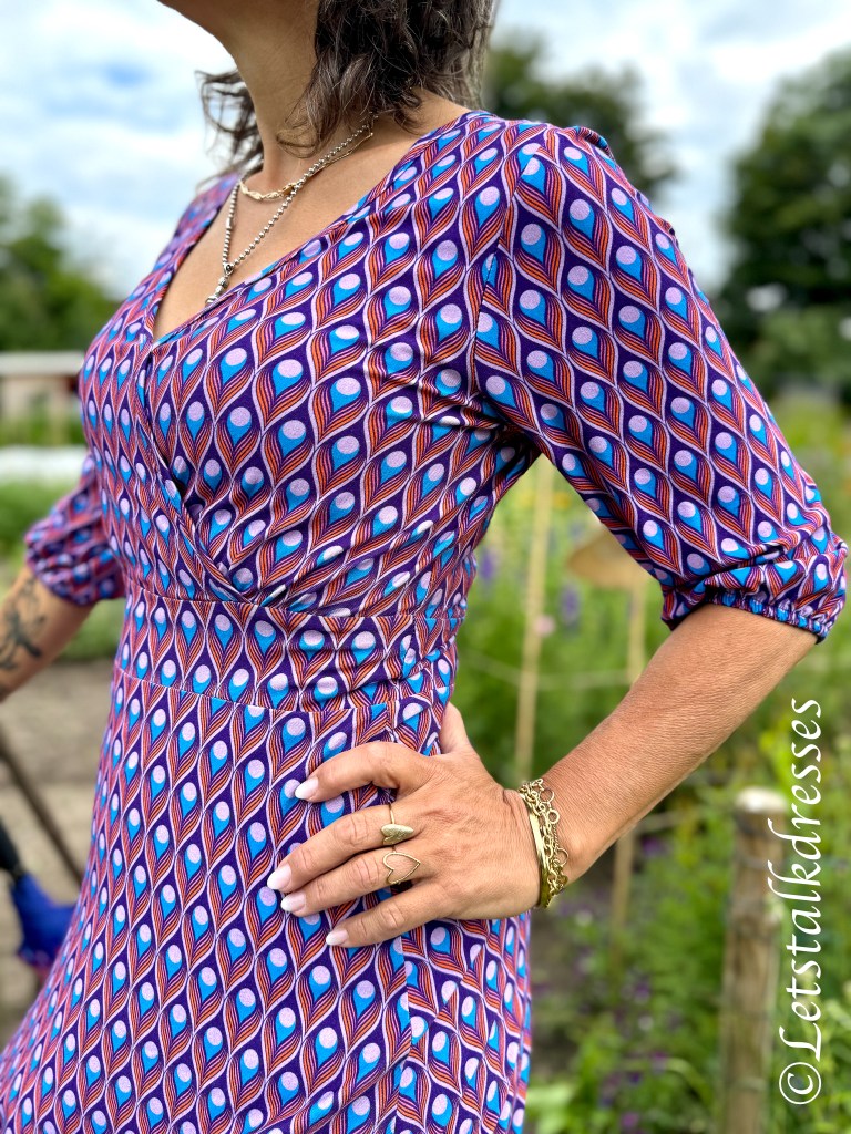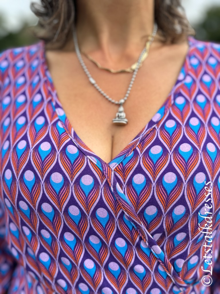 Net als de Havannah, is dress Julia een overslagmodel (Cross-body), maar toch valt deze overslag anders. Allereerst is deze overslag wel met een klein steekje vastgezet om te voorkomen dat ie niet veel te ver openvalt. De ruimte in de overslag zit hier namelijk meer in de kleine plooitjes onder de buste.